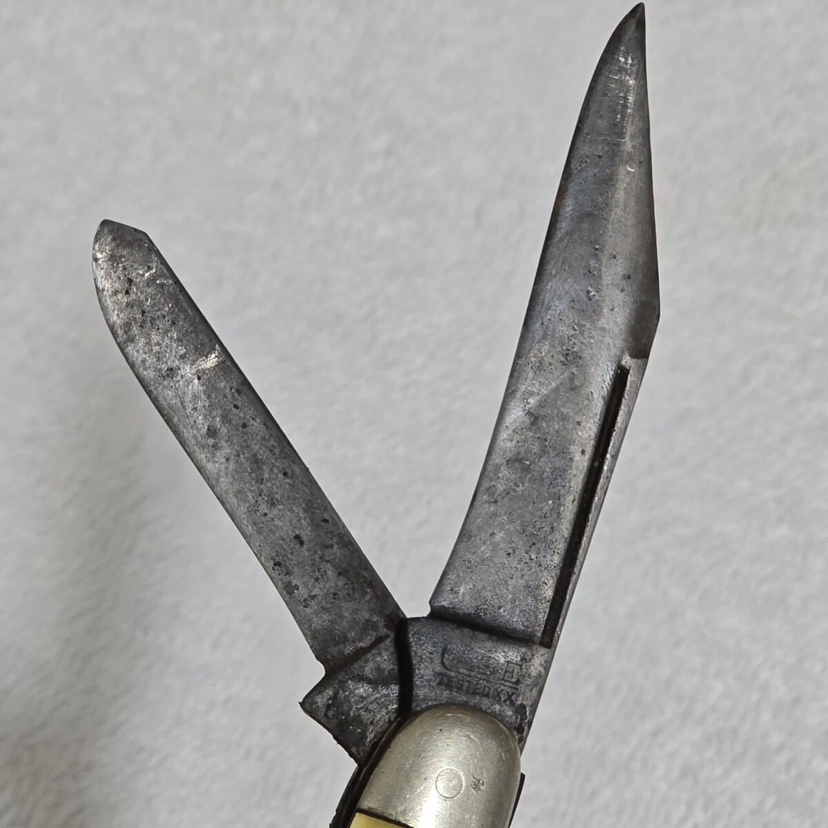 ***Dirty blades show patina and wear, handle scales cracked and chipped, bolsters show wear. Could use cleaning or restoration. Please see photos.***