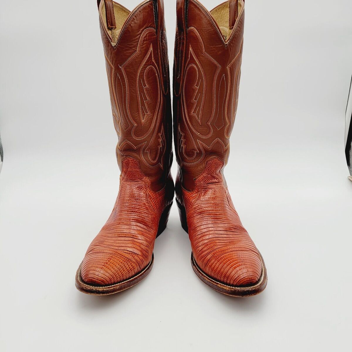 Up for sale are these vintage Cowtown boots in a stunning orange-brown color. These boots are made with a combination of leather and lizard skin, giving them a unique and exotic look. They are designed in a classic Western style and have a model number of 840. These boots are perfect for any cowboy-themed event or for everyday wear. The boots are in great shape and are ready to be worn by a new owner.