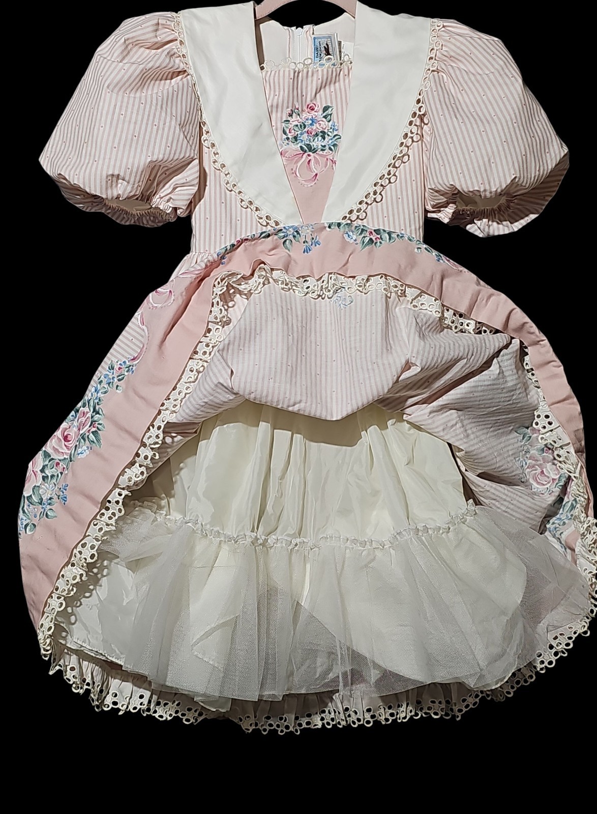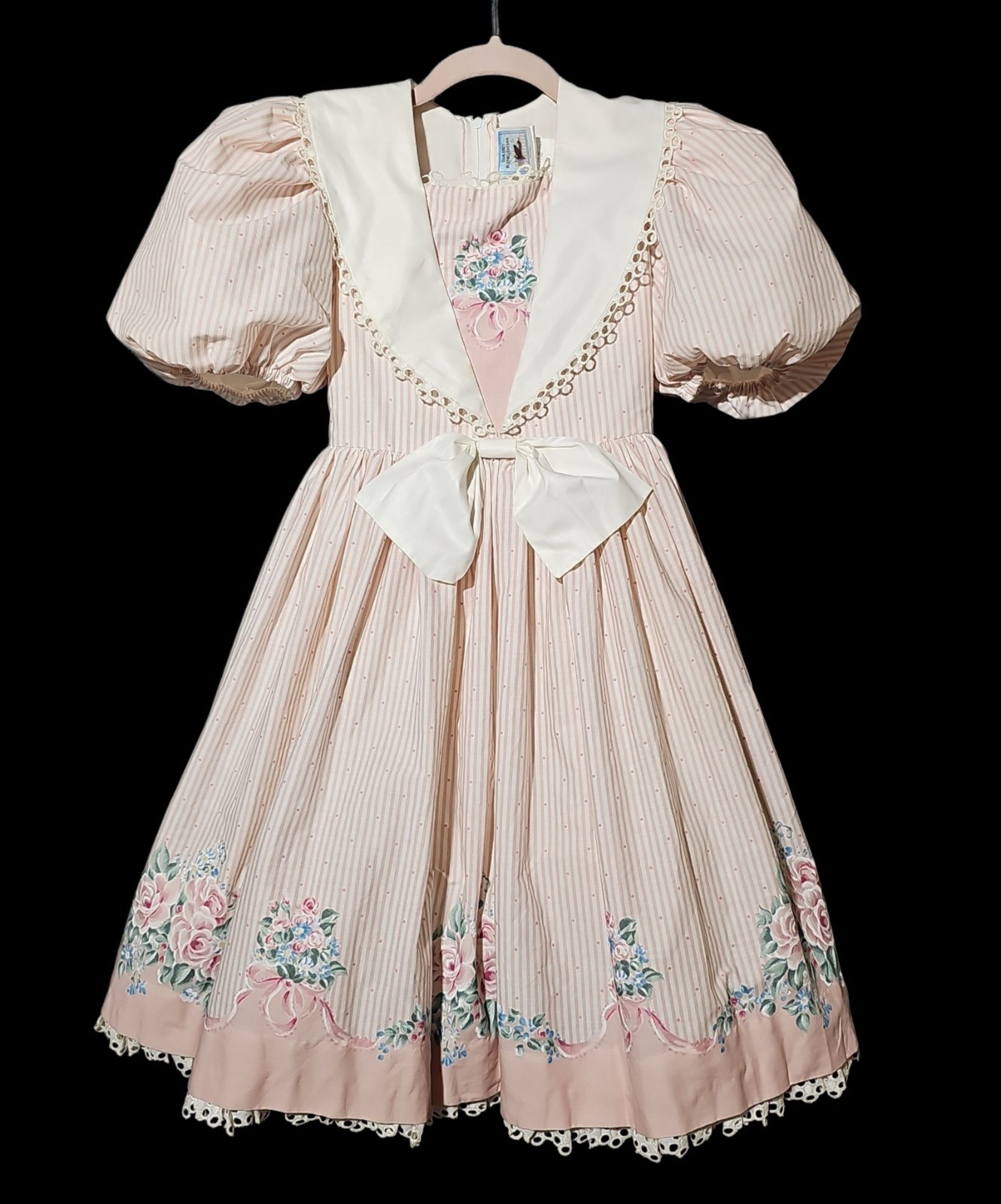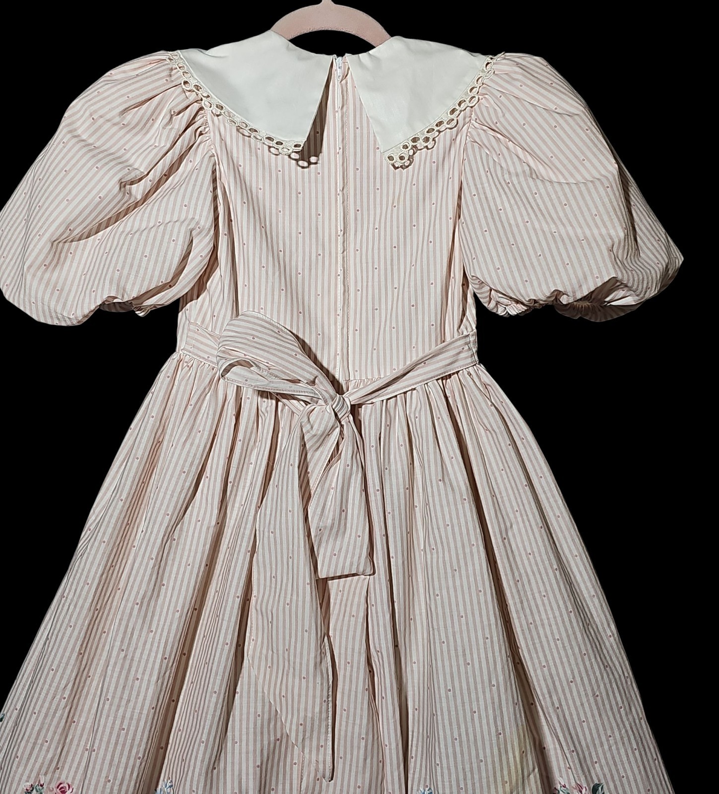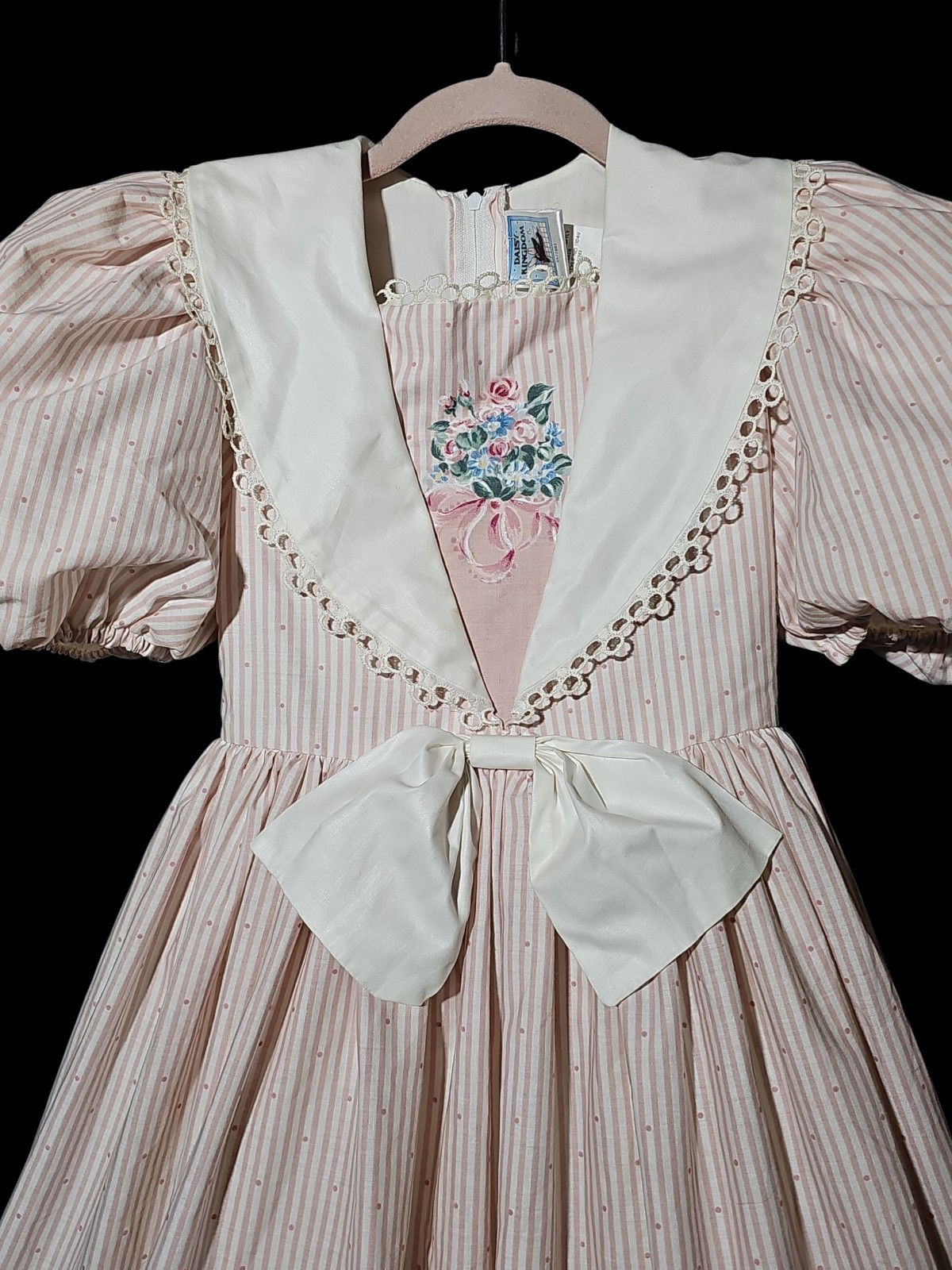 UP FOR SALE: This is a vintage Daisy Kingdom girls? dress from the 1990s, featuring a pink and white striped floral print with puff sleeves, lace trim, and a full skirt with attached sash ties. Made from 100% cotton with built-in fullness for that classic Daisy Kingdom silhouette.