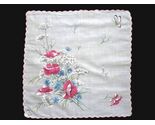 Exceptional vintage 15? x 15? Burmel "Handkerchief of the Month?. It features pink, blue, and white flowers and a single butterfly on a background of white with a pink scalloped edge. It is new and in excellent condition.