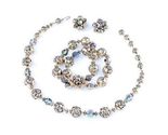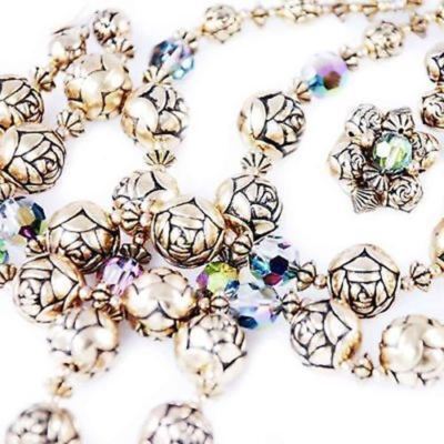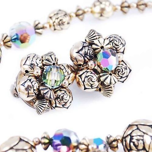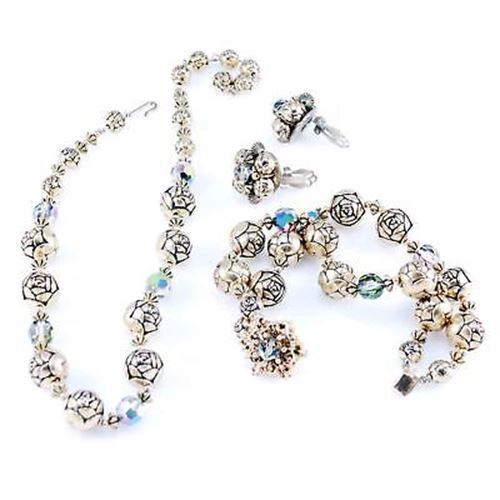 Unusual vintage goldtone necklace, bracelet, and clip-on earrings of 3-D rose and faceted aurora borealis crystal beads. The necklace is 5/8? wide x 18? long, the bracelet is 5/8? wide by 8? long with an exceptional clasp, and the earrings are 1? x 1?. All are in excellent condition.
