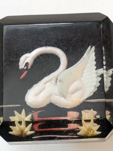 This vintage swan/goose water drawer pull is a unique addition to your antique collection that measures 2 1/8 inches square. The lucite material and colorful square shape make it suitable for costumes and sewing projects. It was manufactured before 1930 and is an original vintage item. The maker is unknown, adding to the mystery and intrigue of this piece. The painted design on the reverse carving is exquisite, depicting a beautiful swan or goose gracefully swimming in water. This button can be used not only as a drawer pull but also as a decorative item on clothing or accessories. Add this one-of-a-kind item to your collection today!