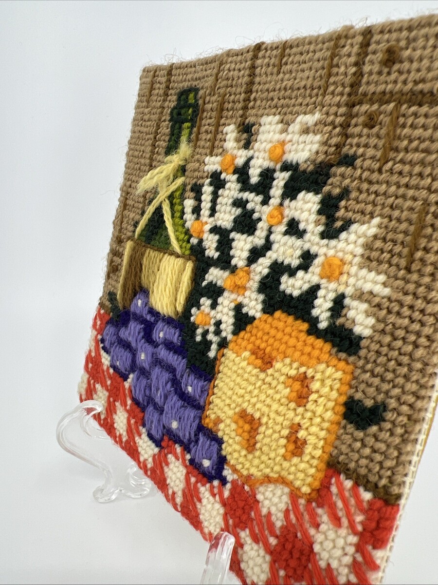 - VTG Needlepoint Crosstitch Embroidery Wine Cheese Grapes 5x5” Cottage Core