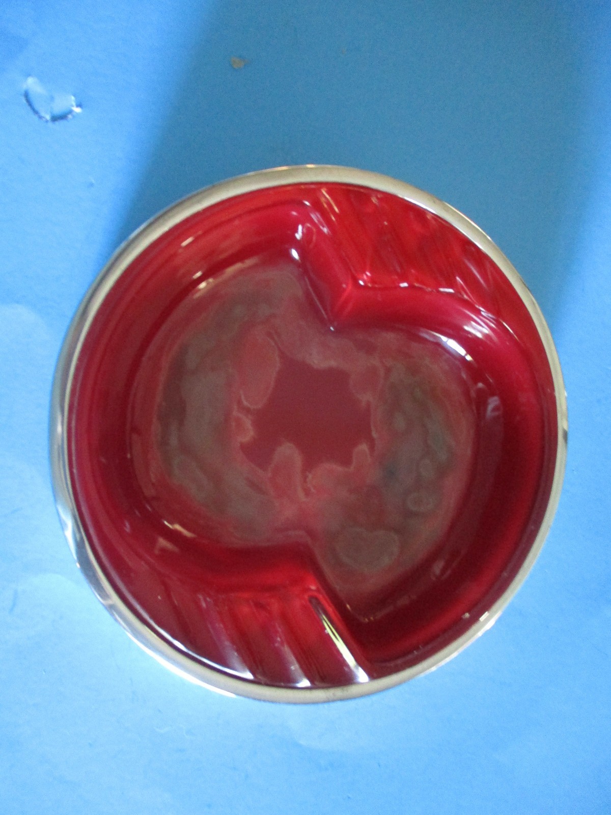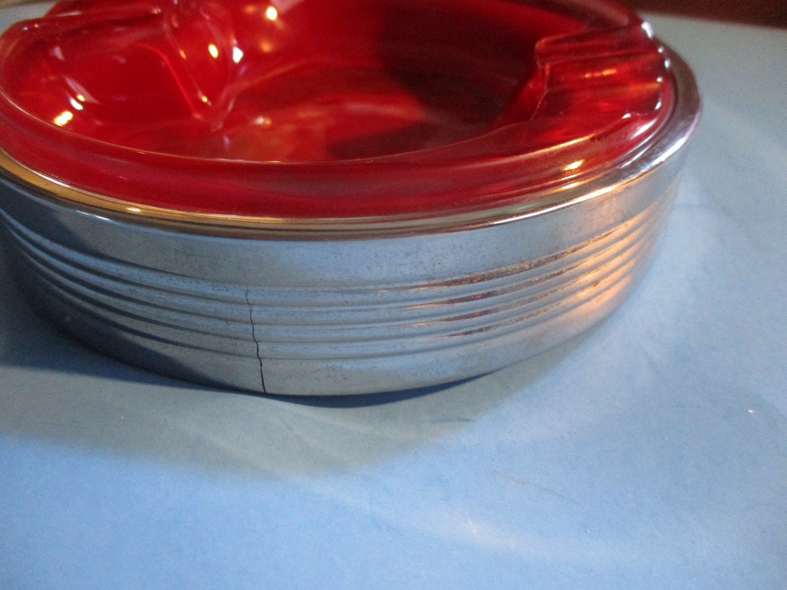 - VTG/RETRO ASH TRAY RIDGED SILVER COLOR RIM W/DEEP RED GLASS INSERT 1#, 6" WIDE