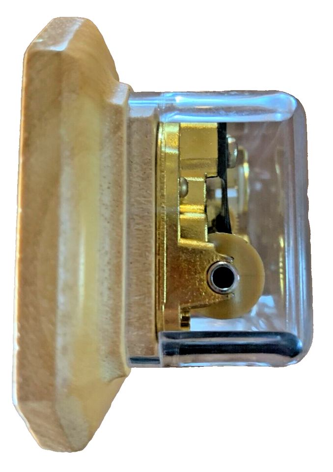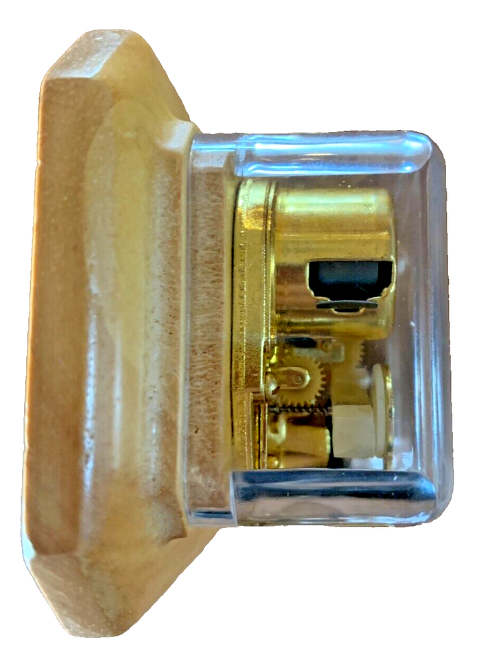 This vintage Sankyo wind-up music box from Japan measures 2-1/2 inches in length, 1-3/8 inches in height, and 2-1/2 inches in width. Situated on wooden base with dimensions 3-1/2 x 3 inches.