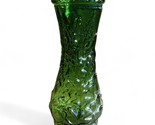 This vintage vase is a stunning piece of art glass manufactured during the mid-20th century. The emerald green color and all-over pattern of embossed foxtails and oak leaves make it a beautiful addition to any collection or display.