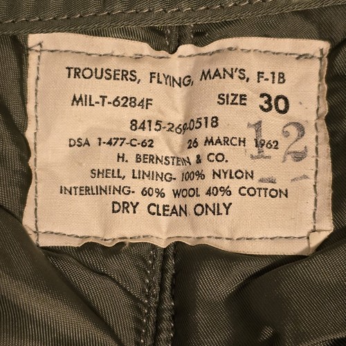 Excellent Condition Vintage H. Bernstein USAF Flying Insulated Parachute F-1B Pants / Trousers Vietnam War - 1962. Men's Tag Size 30. Actual measurements: 31" waist, 29" inseam. Nylon / Wool / Cotton. Extremely Heavy-duty / Heavyweight.