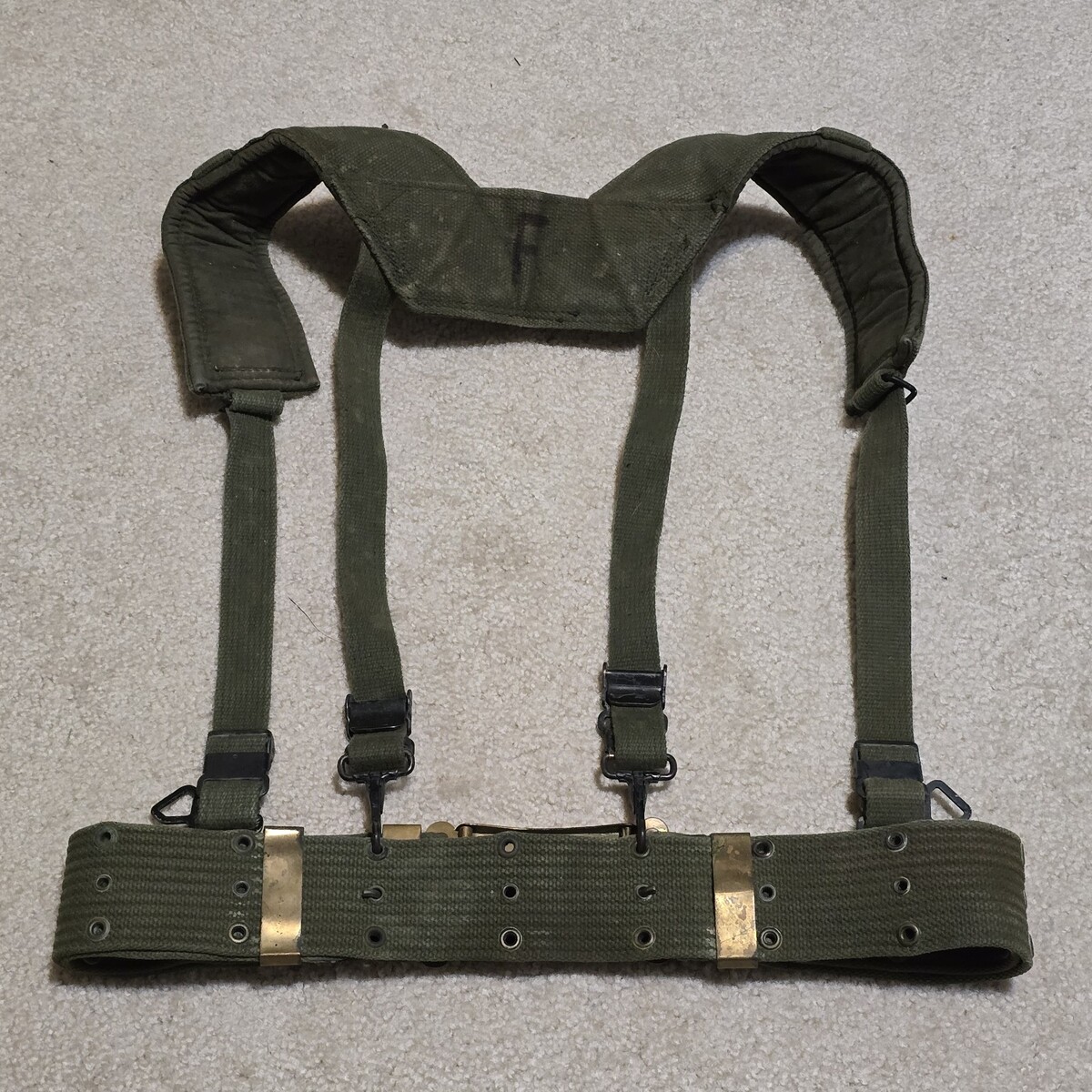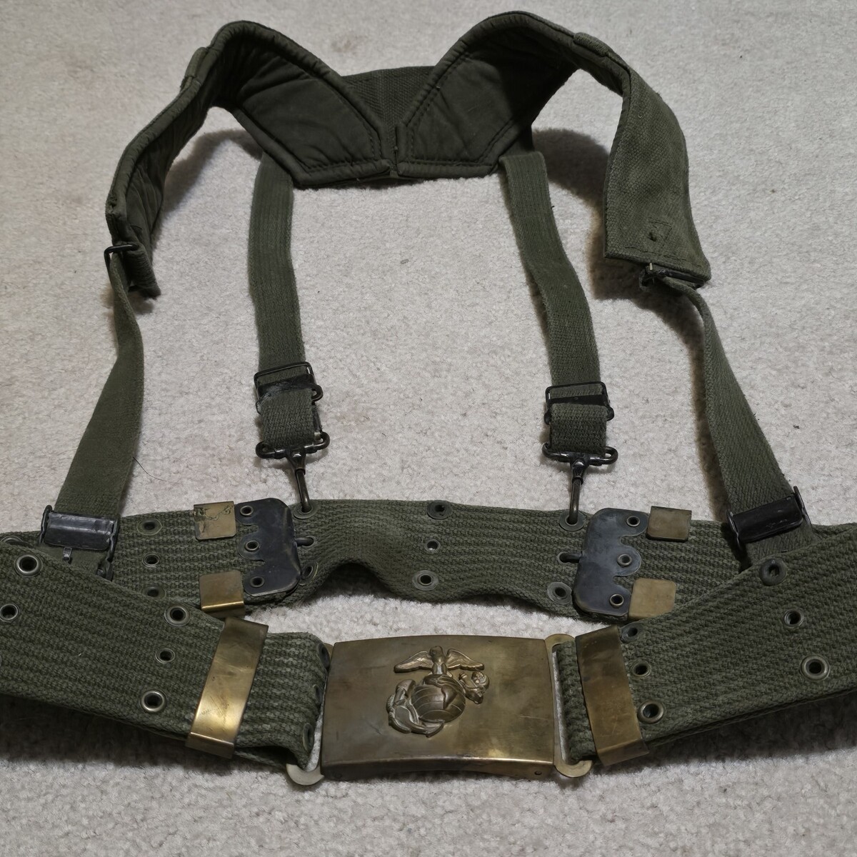 VTG USMC M1956 Horizontal Weave LBE OD Web Belt Size L Suspenders Brass Buckle