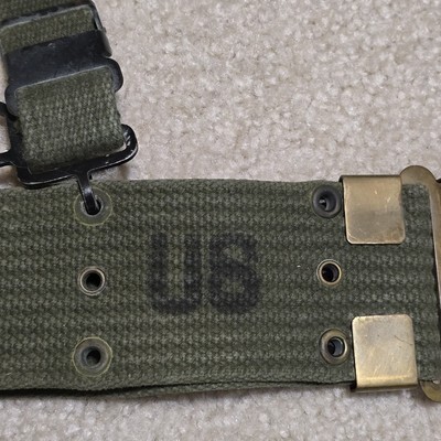RARE vintage, authentic Vietnam War U.S. Marine Corps M1956 Horizontal Weave Load Bearing Equipment (LBE) OD Web Belt, original U.S. Vietnam issue, size Large. Measures 30.5 inches as photographed but extends fully up to 56 inches. Includes original matching suspenders. Features solid brass USMC Eagle Globe Anchor buckle and brass fittings. Patina is present, not polished. Green military webbing with original, hard-to-read markings intact; the ?U.S.? Stamp is marked plainly. Please see all photos for the exact condition.