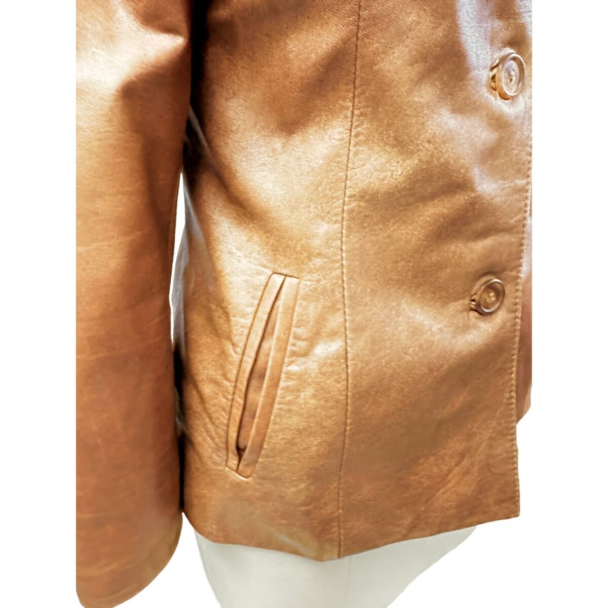 Cognac brown genuine Italian leather; lined interior; notched collar; shoulder pads; French buttonhole pockets.