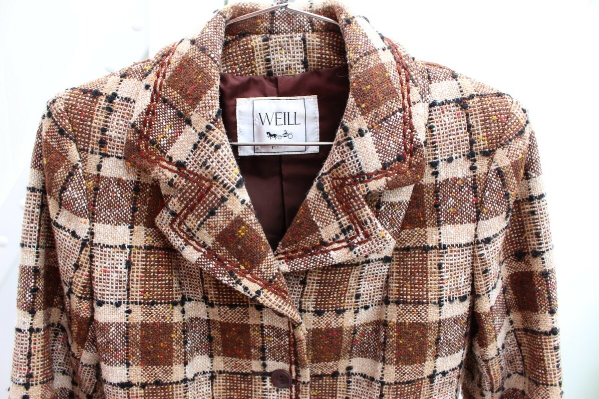 - VTG Weill Paris Blazer Jacket Brown Tweed Plaid Wool Blend Fitted Coat Sz S/M
