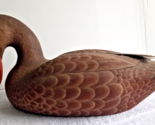 This vintage hand-carved wooden duck decoy is a must-have for any hunting enthusiast. Crafted with intricate details, this solid body decoy is designed to mimic the movements of a wood duck in the water. Its unique features make it a great addition to any collection. The decoy is perfect for those who appreciate the art of hunting and want to add a touch of vintage charm to their collection. The details are exquisite I believe this has never been put in water it's been as a decoration because there is no water damage as there is a cut line on the back of the neck and minor ware on tail other than that she's perfect she's beautiful. Measures approx. 14" long from head to tail 5" from top to bottom and " wide. Please see photos as they are a part of the description.
