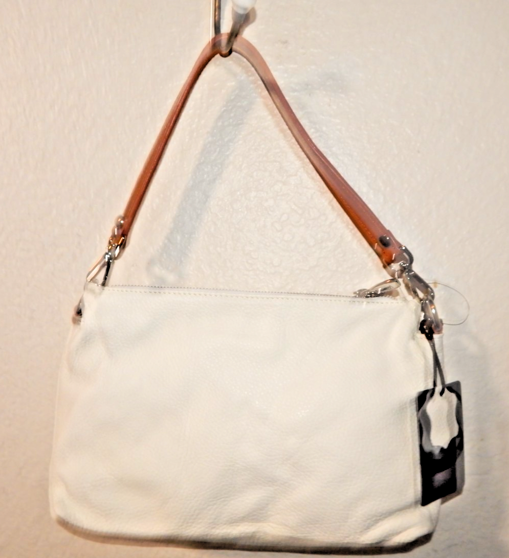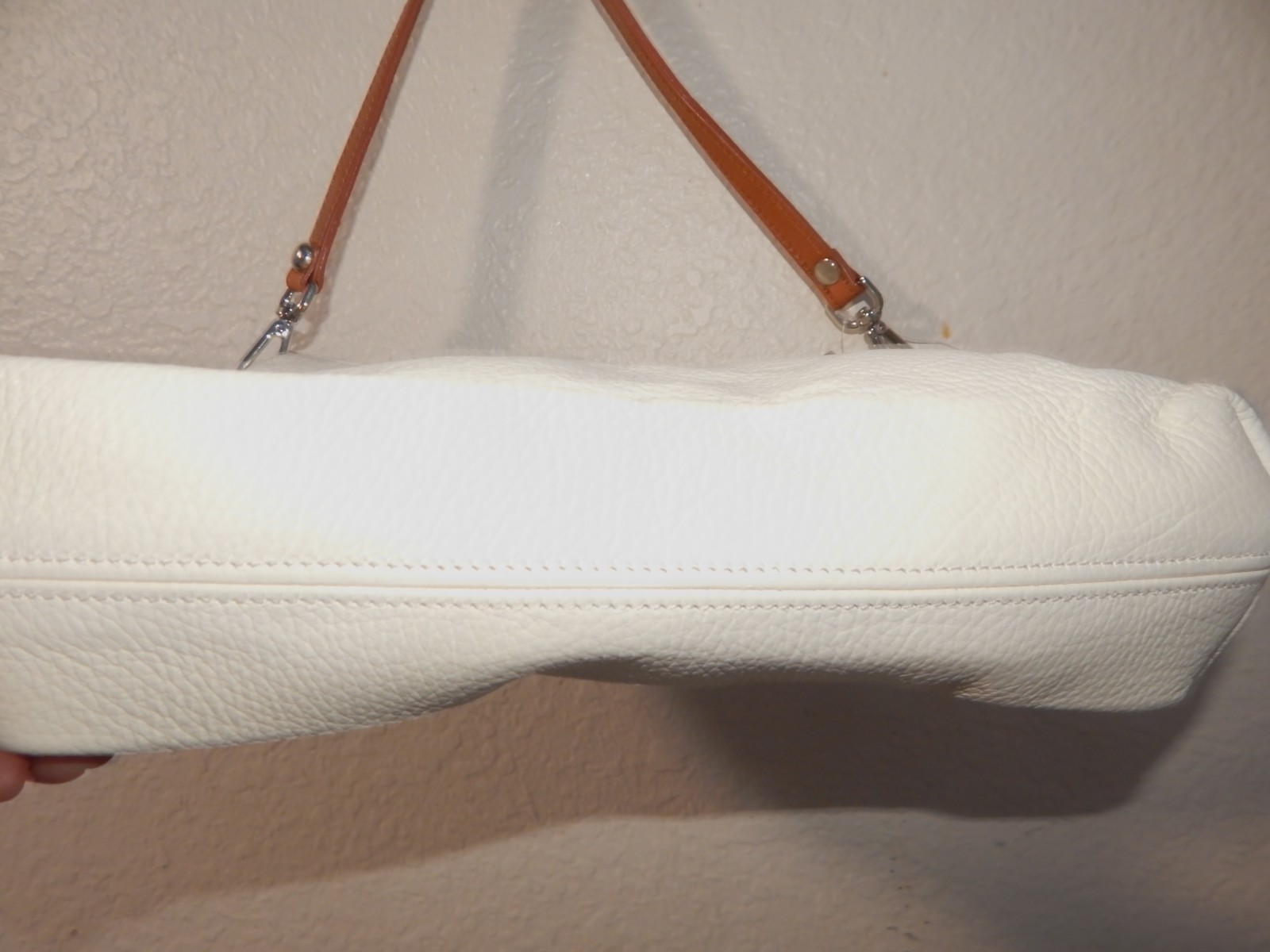 Color: WHITE Exterior with Brown Genuine Leather Handle and Shoulder Strap