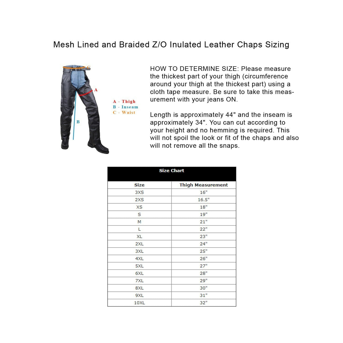 Lined leather chaps Four snap closures at the bottom of each leg Riveted patch style front pockets Lace-cinch back Three strand leather braid runs from waist to bottom of legs.