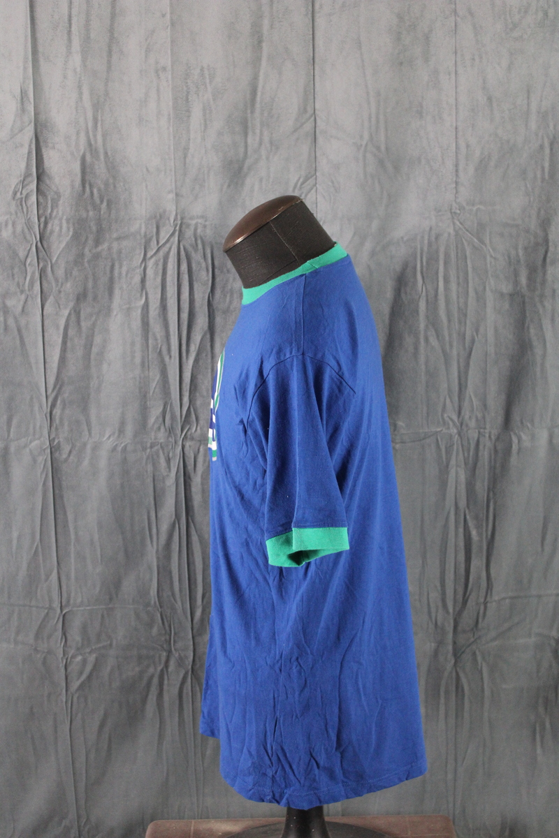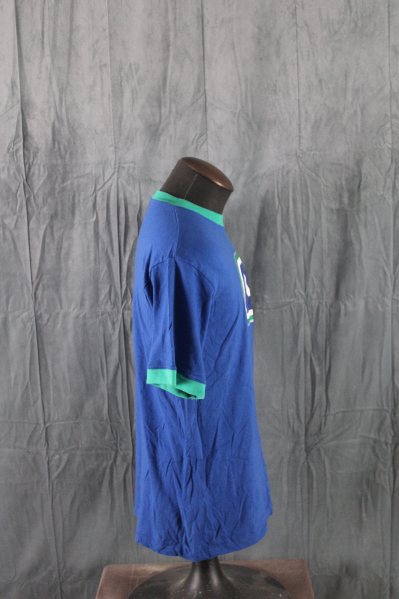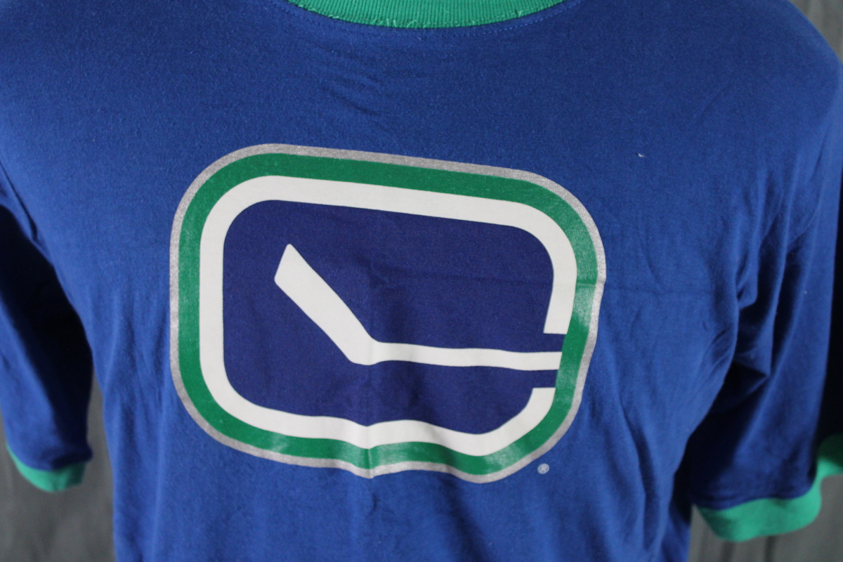 Up for sale is a retro Vancouver Canucks ringer t-shirt. It has a blue base colour with green trim. The chest of the shirt has the Canucks' original stick in rink logo screened on. What a great shirt do not miss out on it.