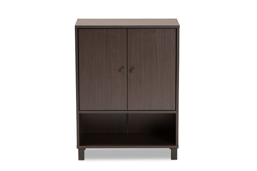 Keep your entryway free of shoe clutter with the Sylvia shoe cabinet. Made in Malaysia, the Sylvia is comprised of a sturdy wood frame showcasing a rich dark brown finish. Two doors conceal three shelves with storage space for up to eight pairs of shoes. Additional shoe storage is provided by an open shelf on the bottom of the cabinet. Requiring assembly, the Sylvia features circular cut-outs on its back to enable air circulation and prevent mold growth on shoes. Black finished polymer legs and door knobs complete the look, making the Sylvia shoe cabinet an excellent addition to the modern home.