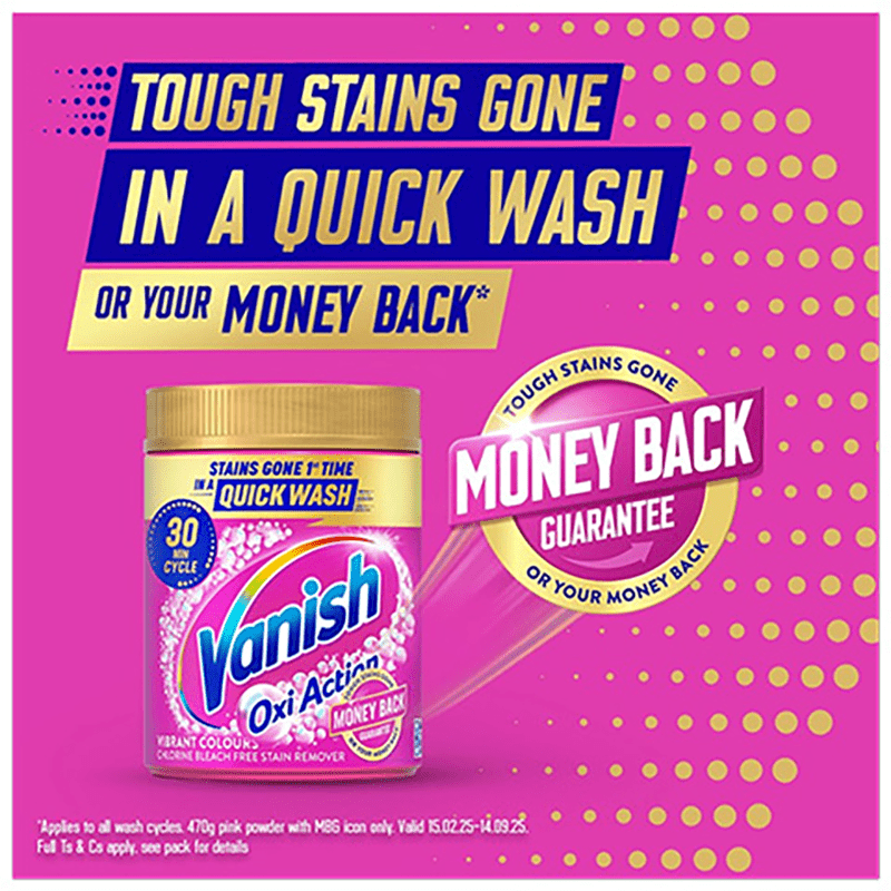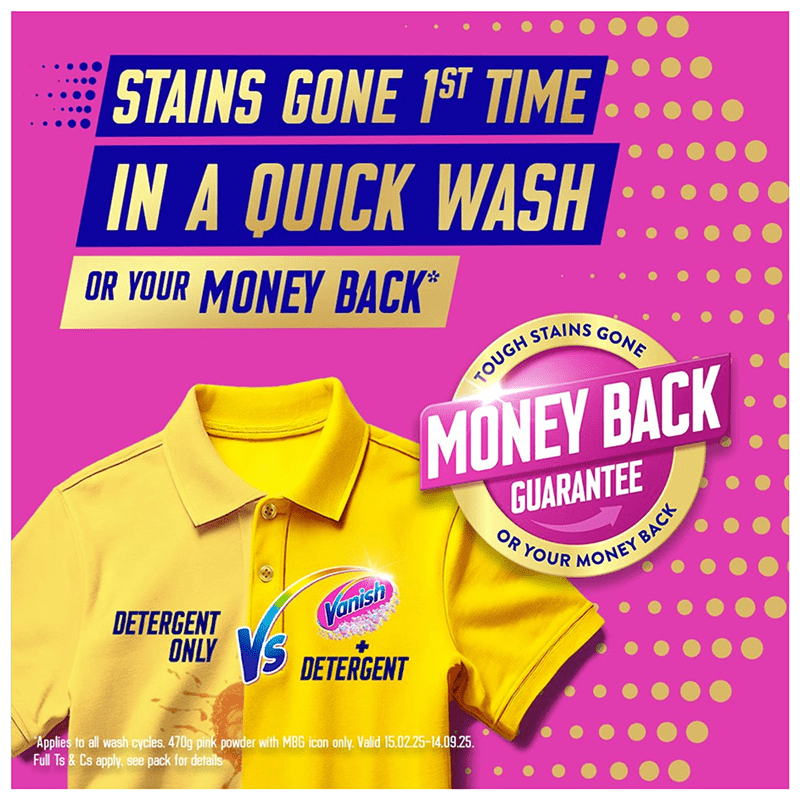 Tackle tough stains the first time?even in a quick wash! Vanish Gold Oxi Action delivers fast-acting, deep-cleaning power that restores brightness, lifts stains and keeps colours vibrant. Perfect for families, busy households and anyone wanting laundry that looks brand new.