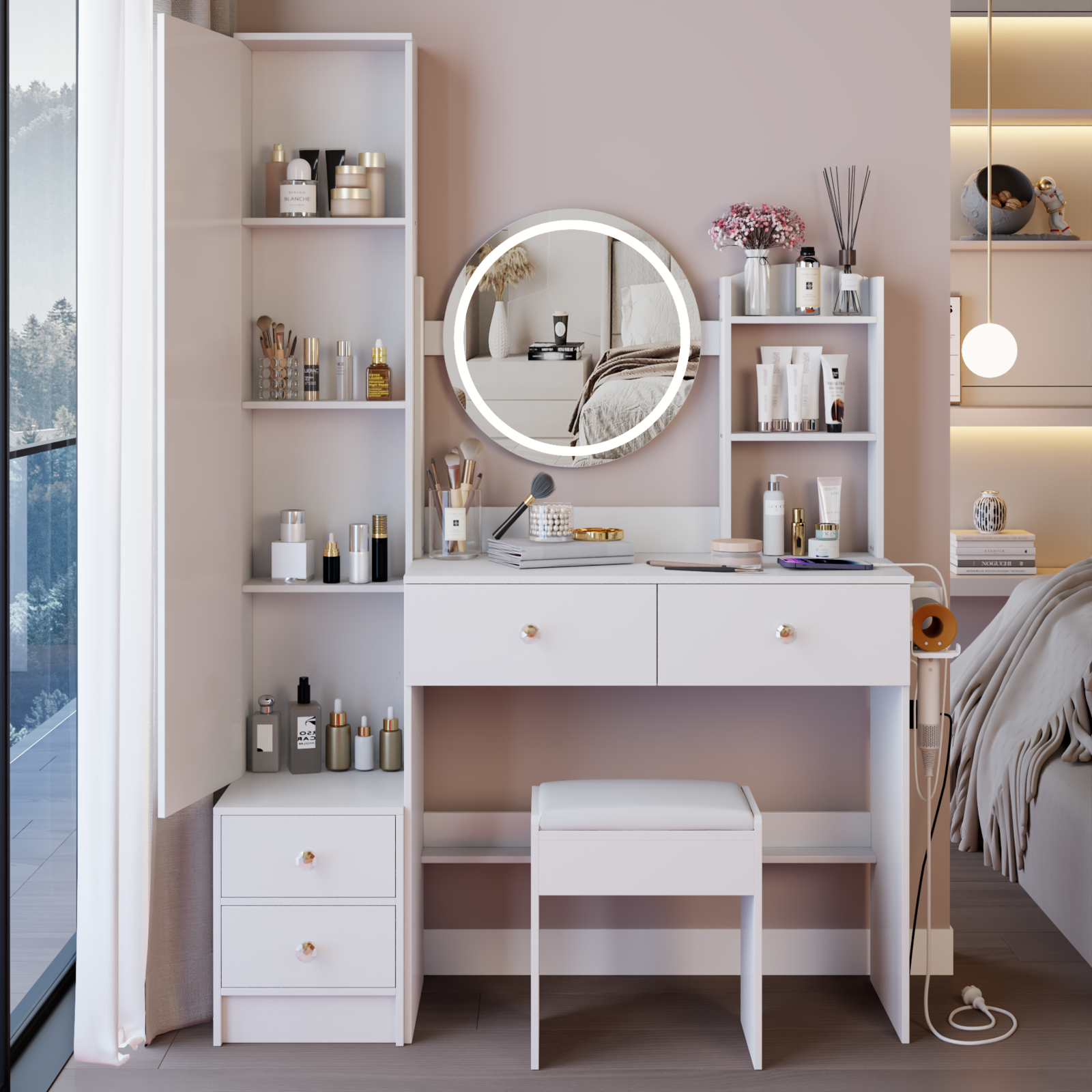[Full body mirror cabinet+vanity table+cushioned stool set]: Our set includes a full body mirror cabinet, a vanity table and a cushioned dressing stool. With one purchase, you receive all three items, saving you time and shipping costs.