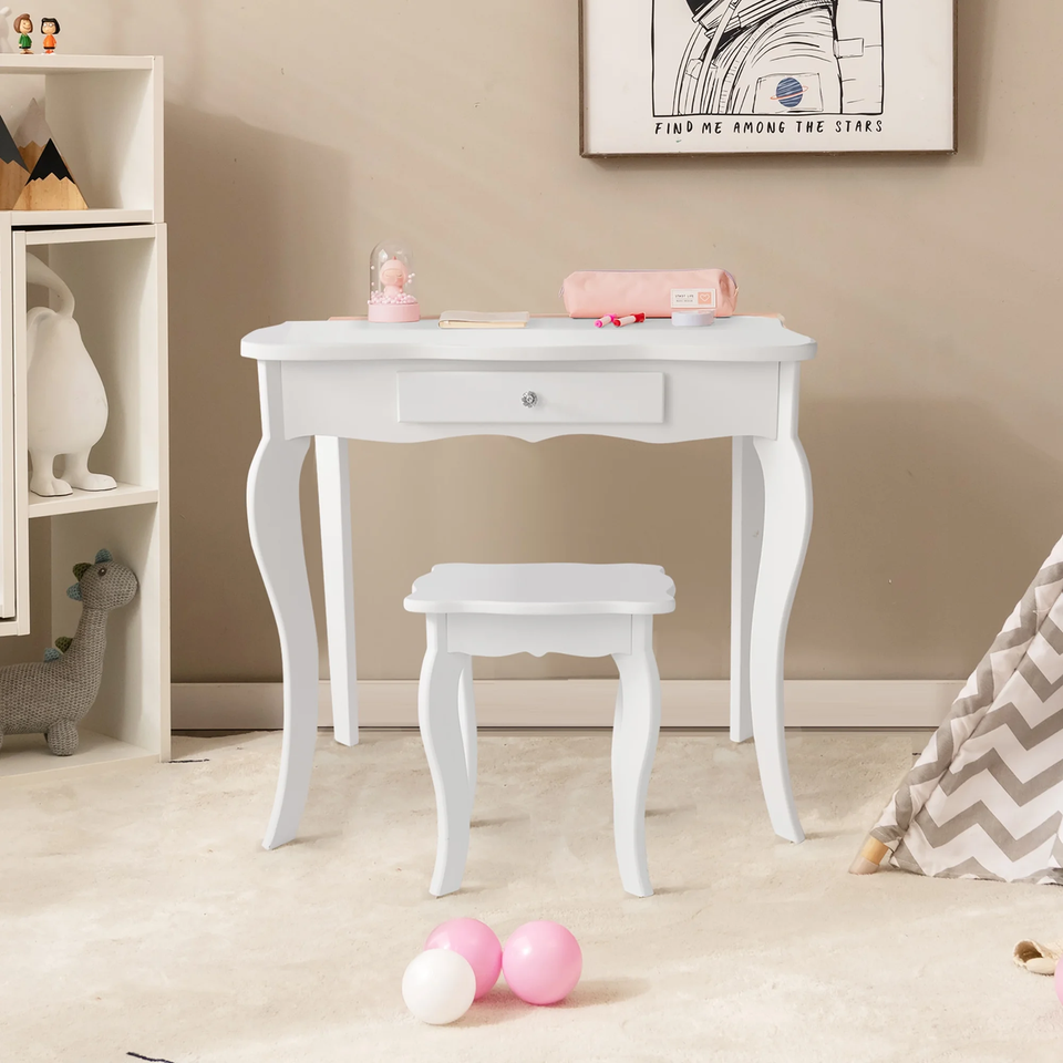 Child Sized Vanity - Every girl wishes to have a glamorous dressing table with all her jewelry and makeup! Purchase an ideal vanity set for your child! Your kids will enjoy their own sized furniture. Made of MDF which has durable construction and will last for a long period time. 180 Spinning Mirrors - The two side mirrors can spin 180and your kids can adjust the angle at their preference. While the middle large mirror offers your kids large view for dressing up. Large Storage Space-Large table surface give your kids enough space to display their beloved accessories, while one larger central drawer gives your kids enough space to store their own jewelries, cosmetics and other personal items which will provides wonderful make-up play-pretend experience for kids. Detachable Top - The top part of the dressing table can be moved away, and your kids can use it as a writing table when necessary. Elegant Chic Design-- The whole design of this dress table is elegant and clean-lined. Simplicity makes you kids feel fresh and natural and match any decoration of their room. Curved legs give strong support to the table and stool.