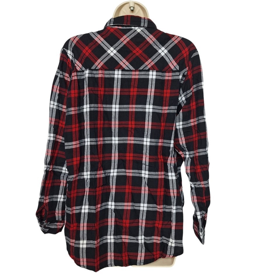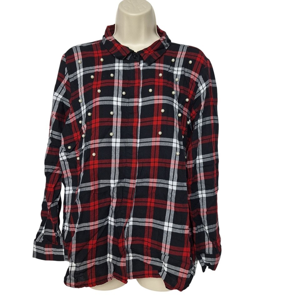 - Velvet Heart Womens Button Up Shirt Size Large Black Red White Plaid Faux Pearls