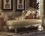 Create an elegant, traditional design in your room with the Vendome Chaise. A hand-crafted piece inspired from the luxurious designs of the past, the beautiful bench features a beige button-tufted back with Nailhead trim, two accent pillows, and elaborately detailed carvings on its legs and apron for a truly sophisticated style. This stunning chaise has a crackled gold patina and bone finish richly accented with gold leaf brushed onto each piece. Introduce a collection of timeless taste and appearance to your room's Decor with an upholstered chaise that will make any home feel refined and comforting.'