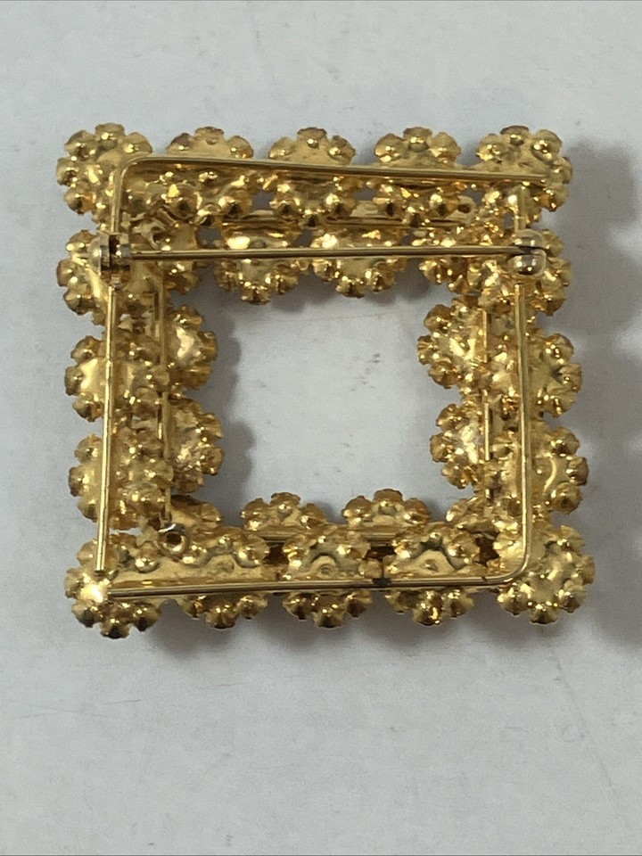 Brooch is 1.5 inches squared and is not missing any stones. Stones held together with prongs so this was higher end costume jewelry work.