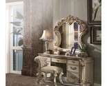 Create an elegant, traditional design in your bedroom with the Gold Patina and Bone Vendome vanity desk. This hand-crafted piece inspired from the luxurious designs of the past, this seven-drawer, desk features elaborate wood carving details, traditional hardware and a sophisticated style.