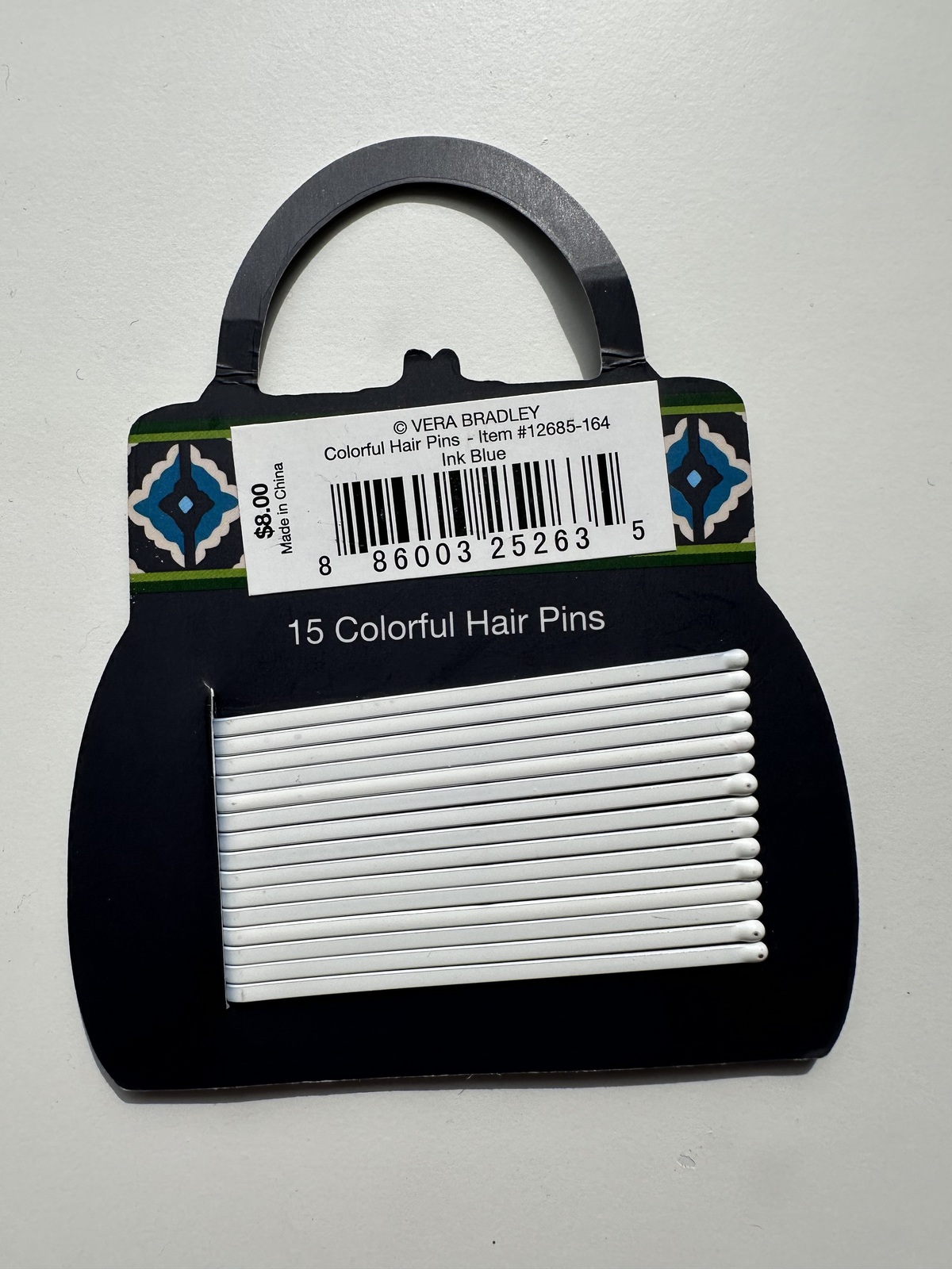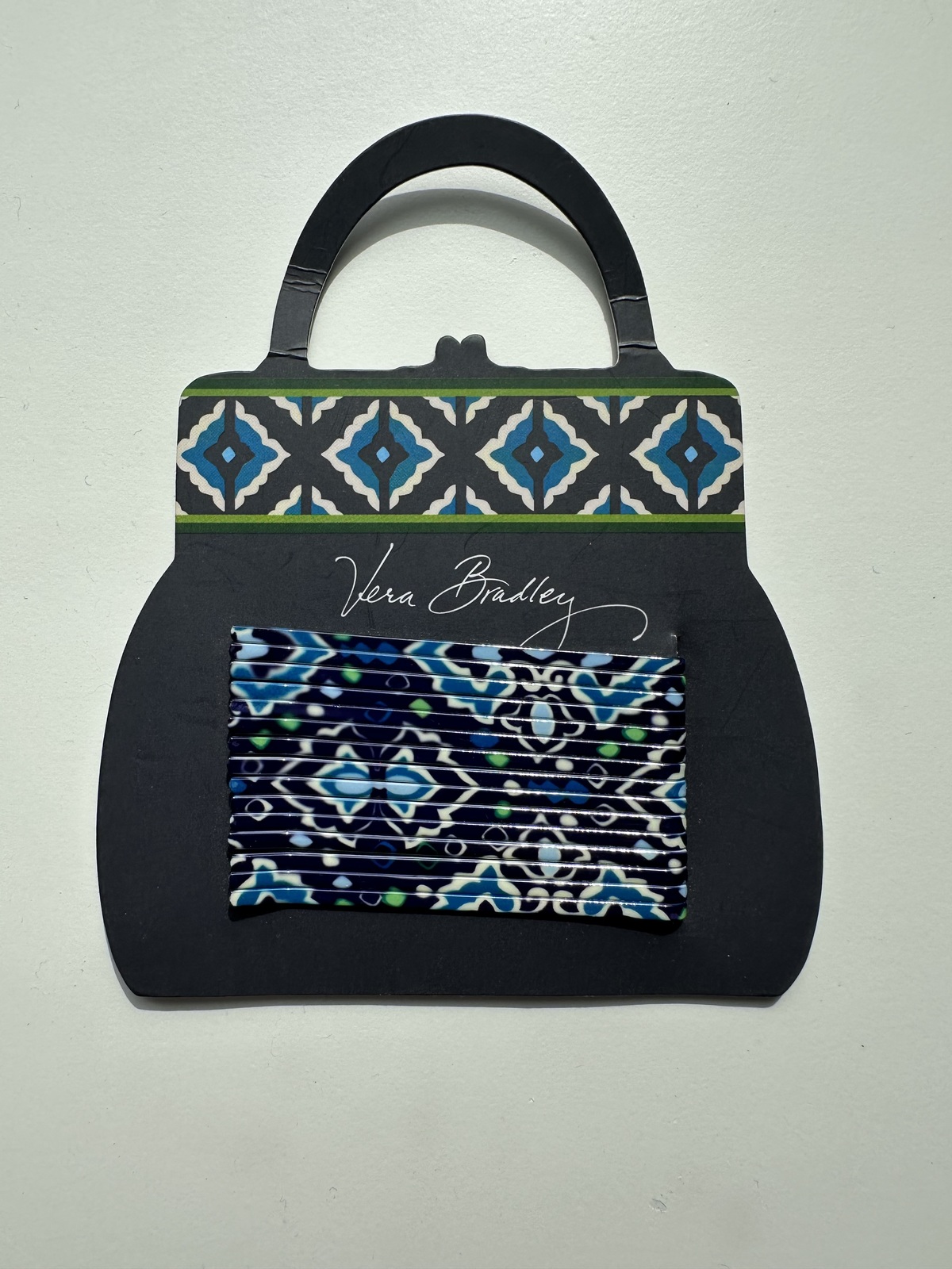 Vera Bradley 15 count navy/colorful hair pins.