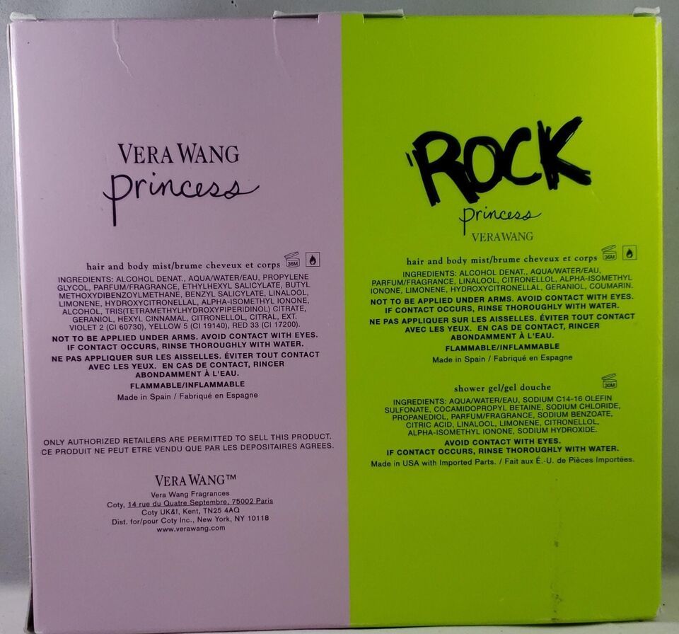 Set Includes: Vera Wang Rock Princess Fragrance Mist 8.4 fl oz and Shower Gel 6.7 fl oz and Princess Fragrance Mist 8.4 fl oz.