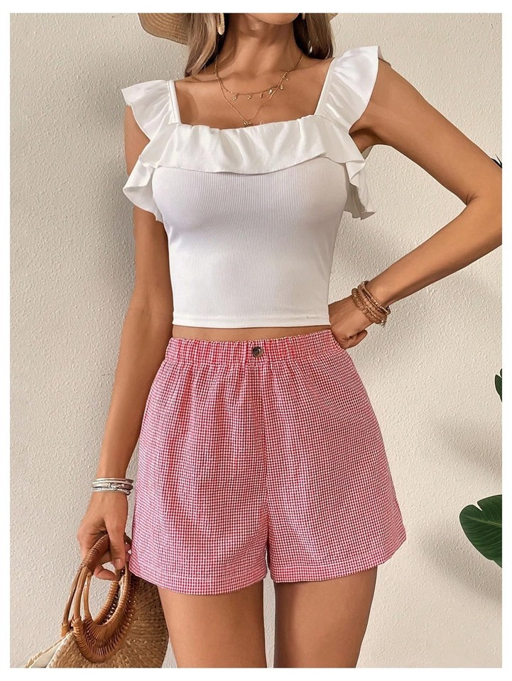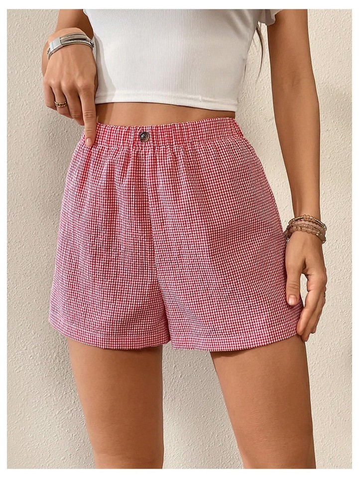 Verdusa Women's Plaid Print Elastic Waist Casual Shorts Red White Size S