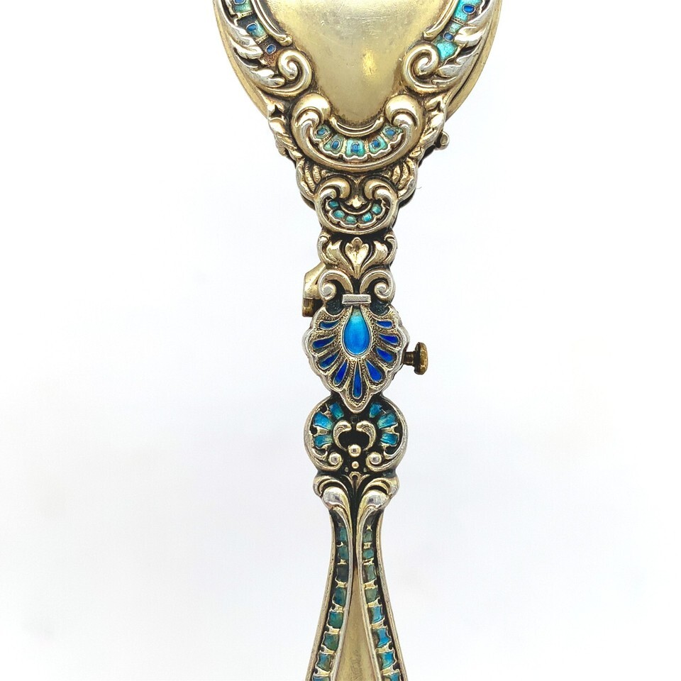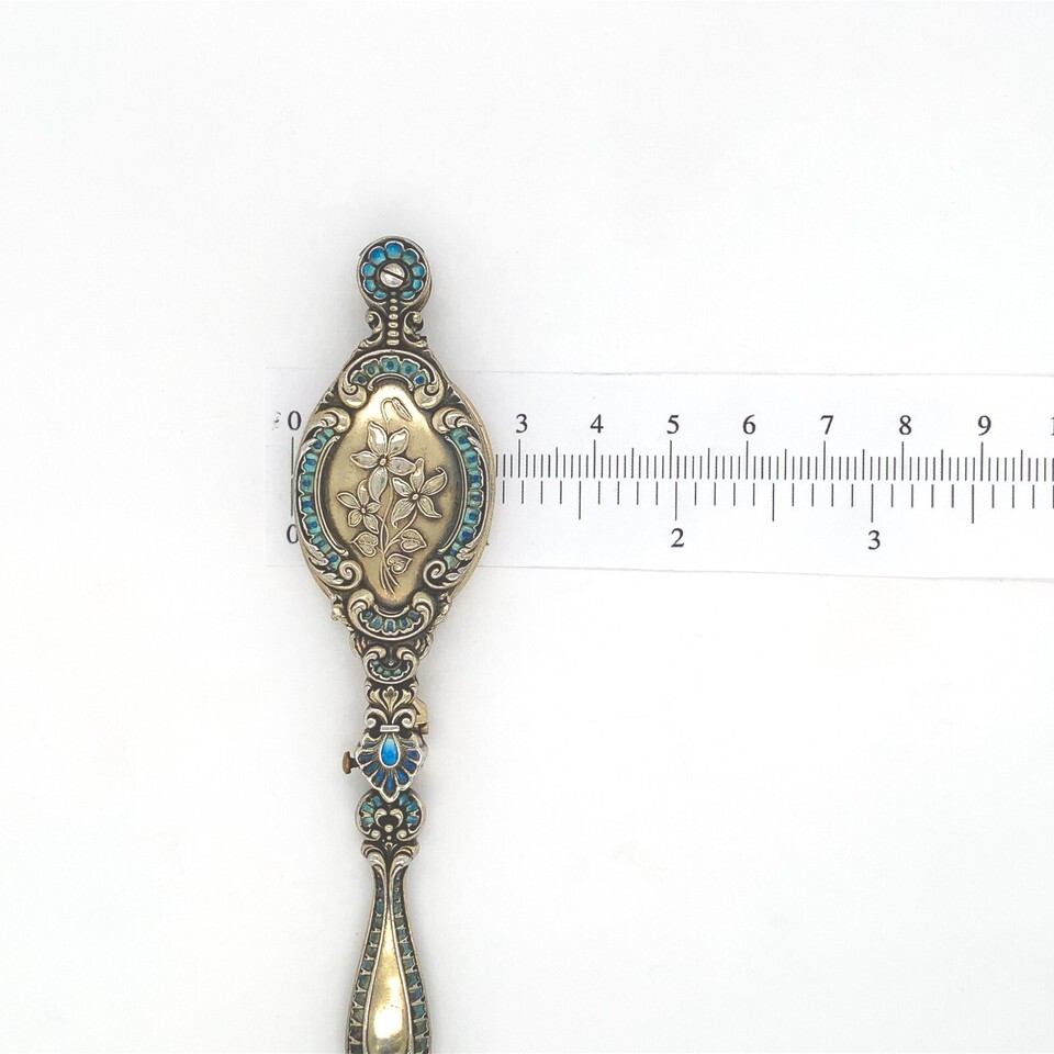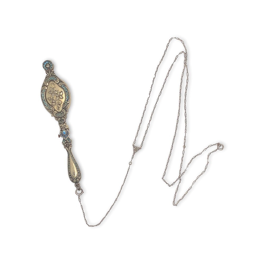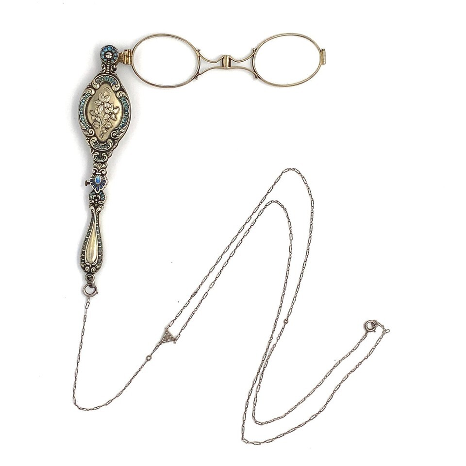 Vermeil Victorian sterling lorgnette with original glasses and vintage chain. The lorgnette measures 4 1/2" by 1" and features turquoise and blue enamel and violet flowers. The original Deco style paperclip chain measures 24" wearable with a 5" drop extension and a filigree triangular panel. The necklace weighs 20.72 dwt., and dates from about 1900. Fabulous!