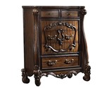 The Versailles chest is the perfect accent to create the style of royalty your bedroom has been needing. This chest crafted in wood with cherry oak finish was inspired by old European design with brown copper metal hardware and intricate wood carvings on the front of the five drawers.