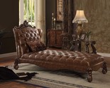Create an elegant, traditional design in your room with the Versailles Chaise. A hand-crafted piece inspired from the luxurious designs of the past, this stunning piece comes in a rich cherry oak finish and features a two tone, light brown, PU button-tufted back and seat with brown accent pillow. Elaborate carving detail along its wood legs and sides add to its sophisticated style. Introduce a collection of timeless taste and appearance to your room's Decor with an upholstered chaise that will make any home feel refined and comforting.'