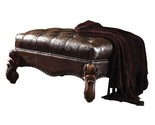 The Versailles Ottoman presents a hand-crafted piece inspired by the most luxurious designs of the past. The stunning PU upholstered ottoman comes in a cherry finish and features a two tone, dark brown, button-tufted seat. Nailhead trim accent and elaborate carving details along its wood legs and sides add sophistication. Introduce a collection of timeless taste and appearance to your room's Decor with an ottoman that will make any home feel refined and comforting.