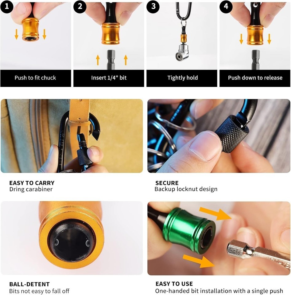 Easy One-Handed Operation: Streamlined workflow with single-handed bit changes. The multi-color design allows for quick identification of the drill bit needed, enhancing job efficiency.