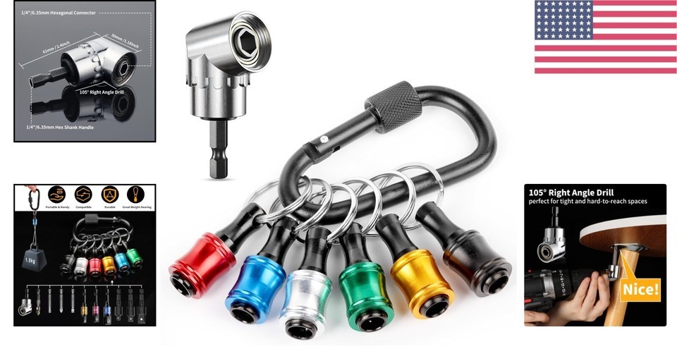 - Versatile 6-Piece Bit Holder Set with Right Angle Drill Adapter for Tight Spaces