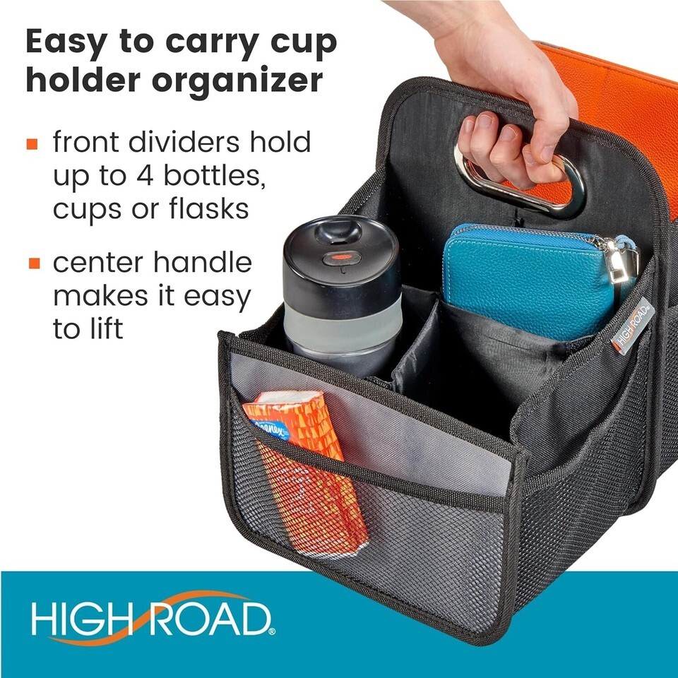 Adjustable dividers in the front compartment provide flexible cup holder storage.