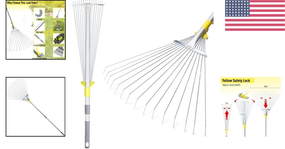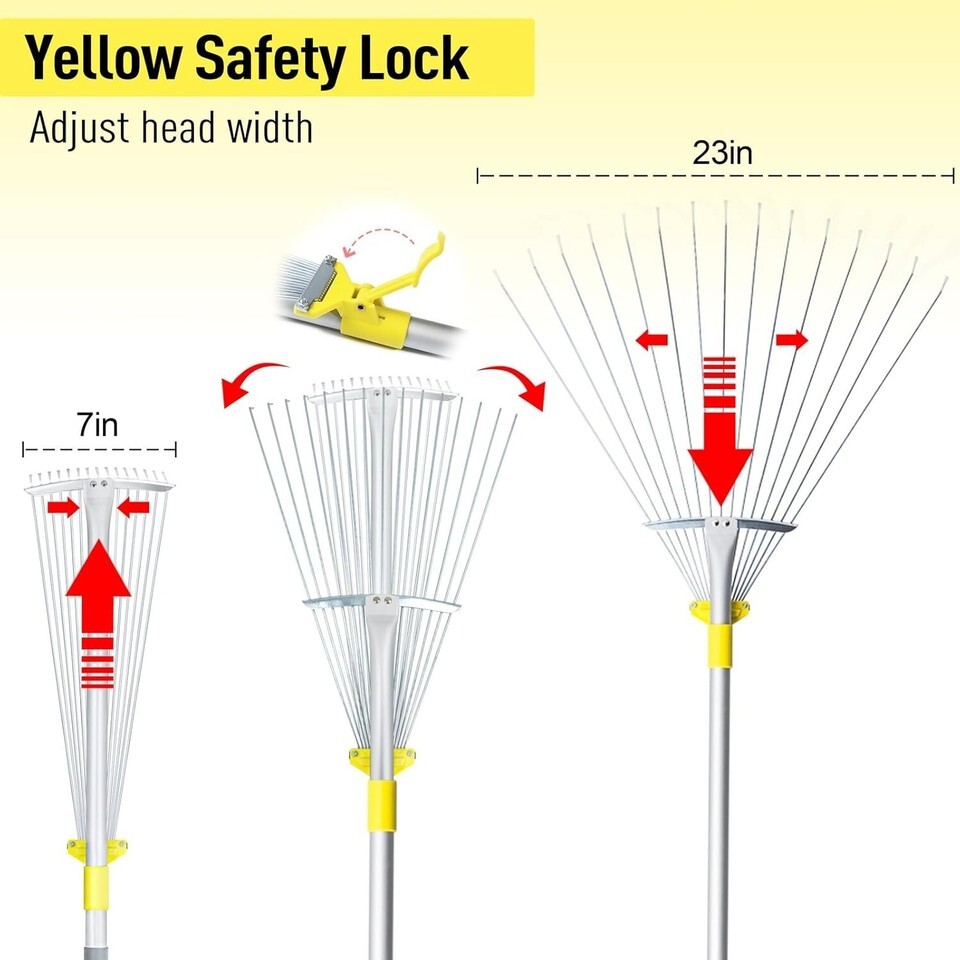 Efficient Raking: Large rake head collects more leaves with each pass, allowing for quick and effective cleanup. Adjust the width effortlessly in seconds with a simple twist of the yellow lock.