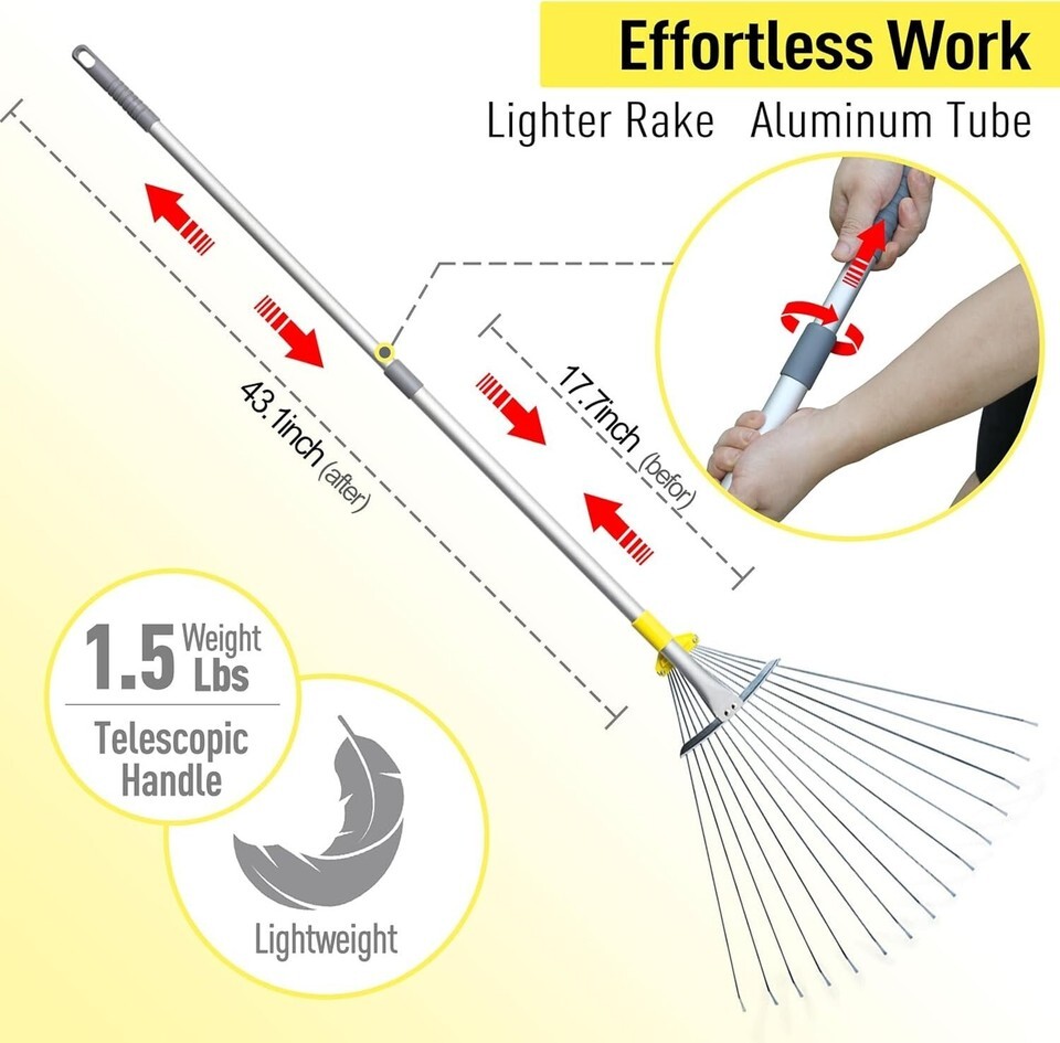 Features: Lightweight,Adjustable,Expandable Head,Durable,Portable,Space-Saving,Efficient Raking,Flexible Tines