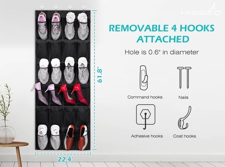 Stable Support: Equipped with 4 sturdy metal hooks, it securely holds up to 40 lbs, keeping your shoes organized and accessible.