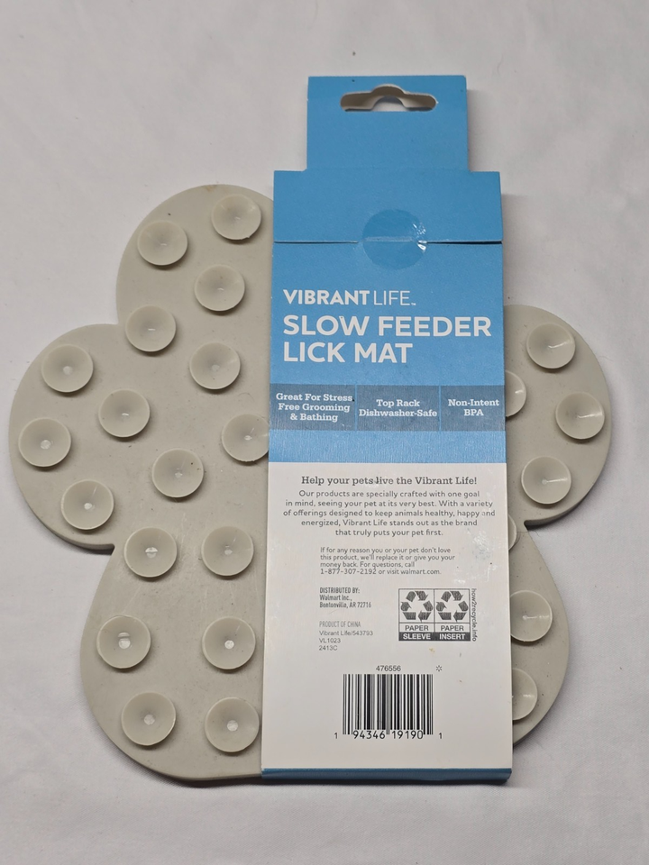 Vibrant Life slow feeder lick mat. Great for stress relief and keeping dogs and puppies occupied. Manufactured with non-intent BPA, which is a lot more honest than saying "BPA Free" because trace amounts of BPAs can often be found in such marketed products, leading to deception and false advertising. Non-intent BPA means that no BPAs were intentionally or purposefully added as a component of the material. Measures 7" in diameter.