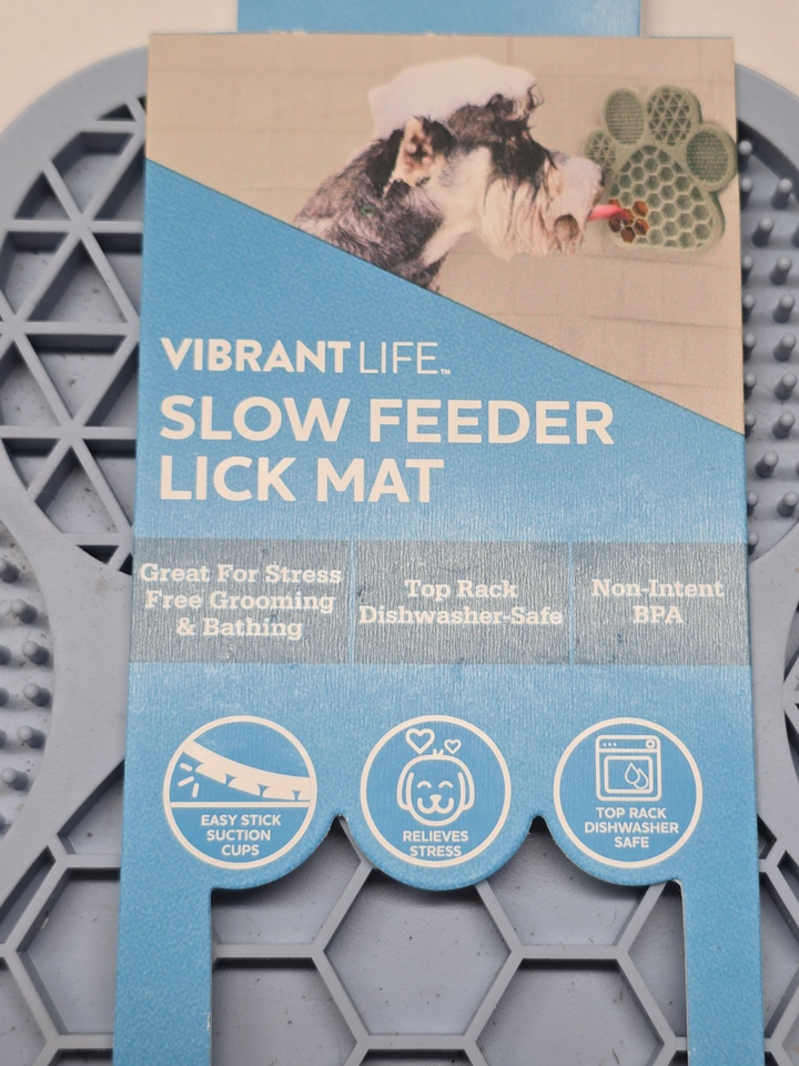 Vibrant Life slow feeder lick mat. Great for stress relief and keeping dogs and puppies occupied. Manufactured with non-intent BPA, which is a lot more honest than saying "BPA Free" because trace amounts of BPAs can often be found in such marketed products, leading to deception and false advertising. Non-intent BPA means that no BPAs were intentionally or purposefully added as a component of the material. Measures 7" in diameter.