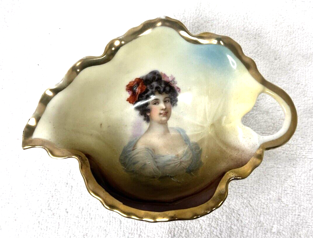 Victoria Austria Leaf Shaped Bowl w Beautiful Woman Bowl w Handle Wide Gold Band