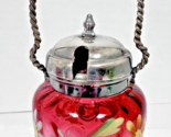 Victoria Cranberry Enameled Floral Glass Mustard w Twisty Handle & Lid w Slot