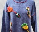 Victoria Jones women's size Large embellished sweater is blue with rope accents at the neck and sleeves. Decorative arrows are beaded and knitted with pompoms. Beading at the fringed hem. Very good condition. 55% Ramie, 45% Cotton; Hand Wash.