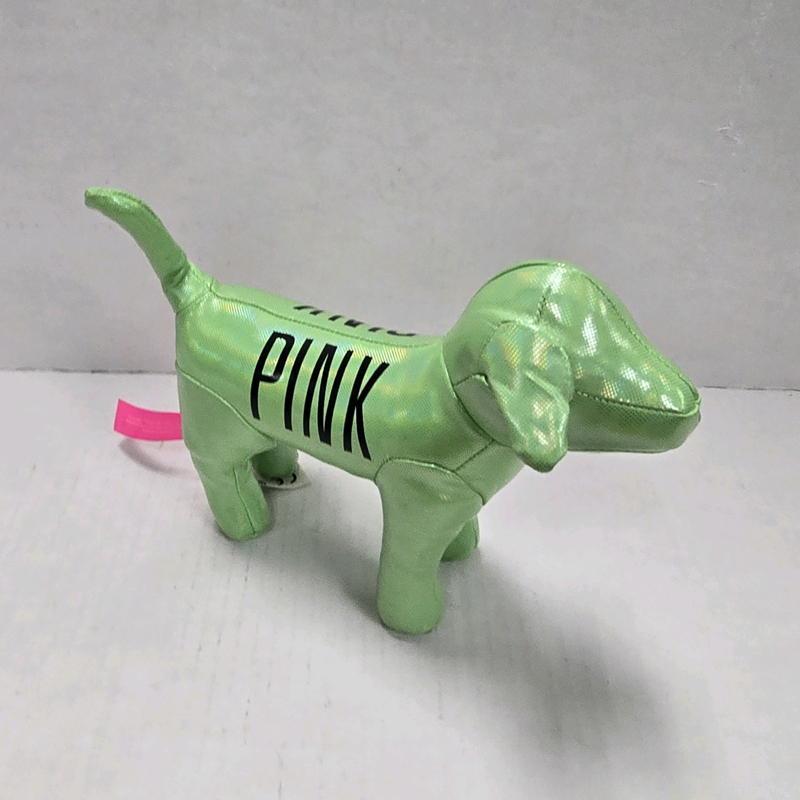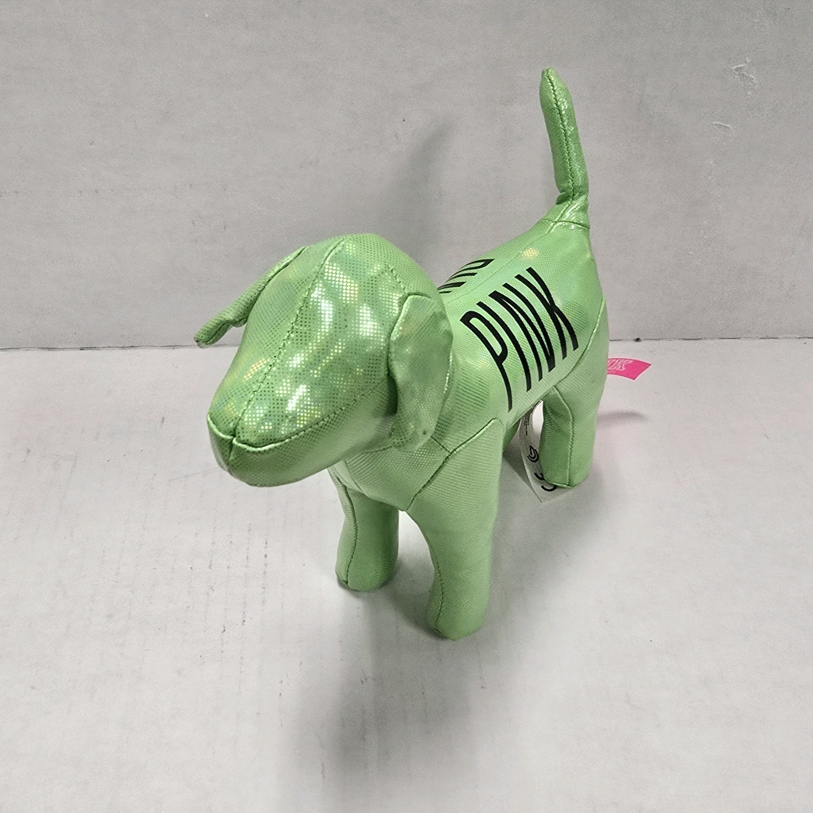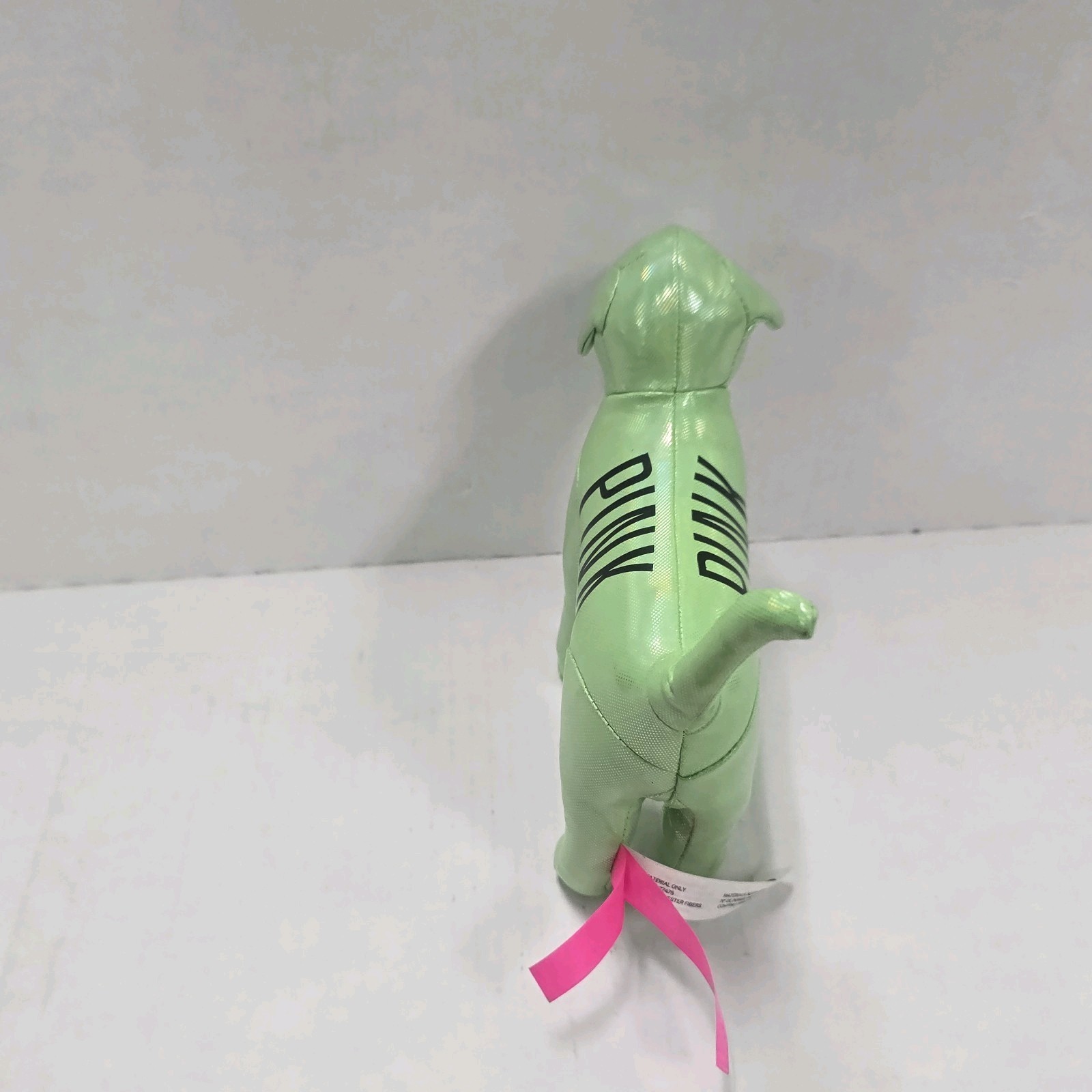 - Victoria Secret PINK Dog Shiny Metallic Neon Green Black Logo Plush Stuffed Toy