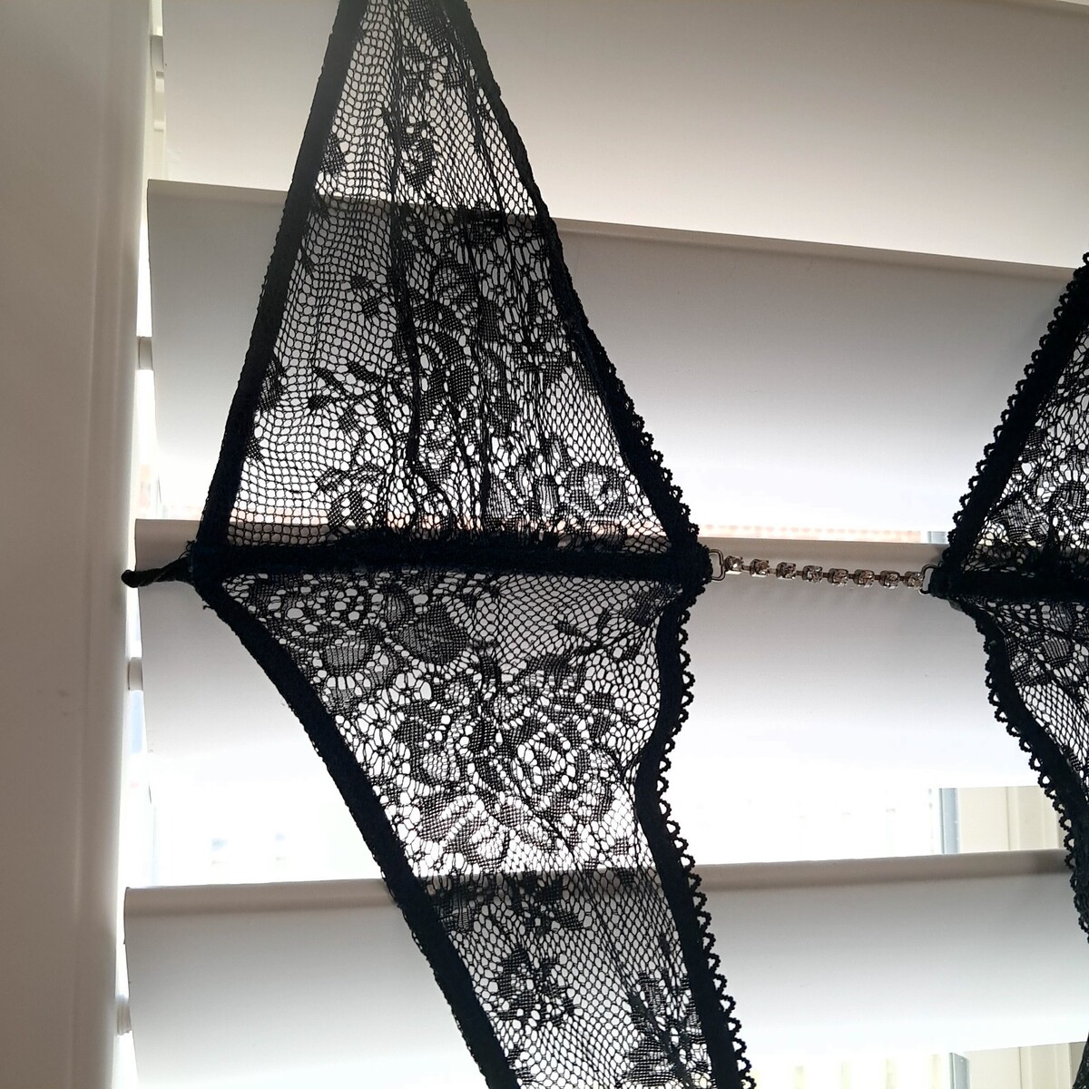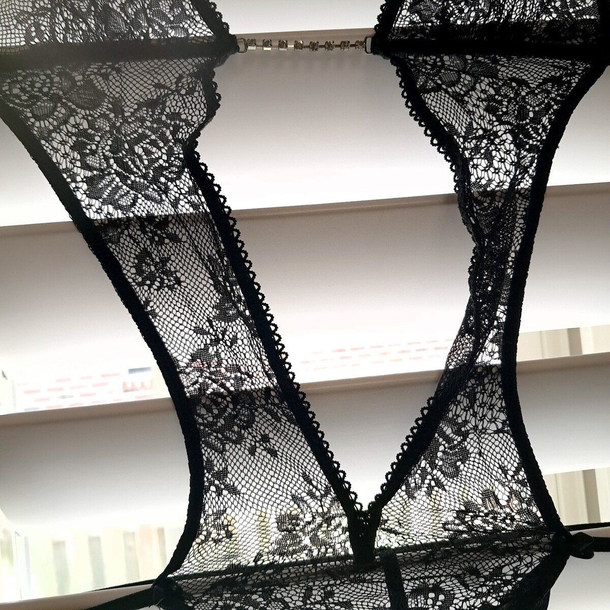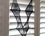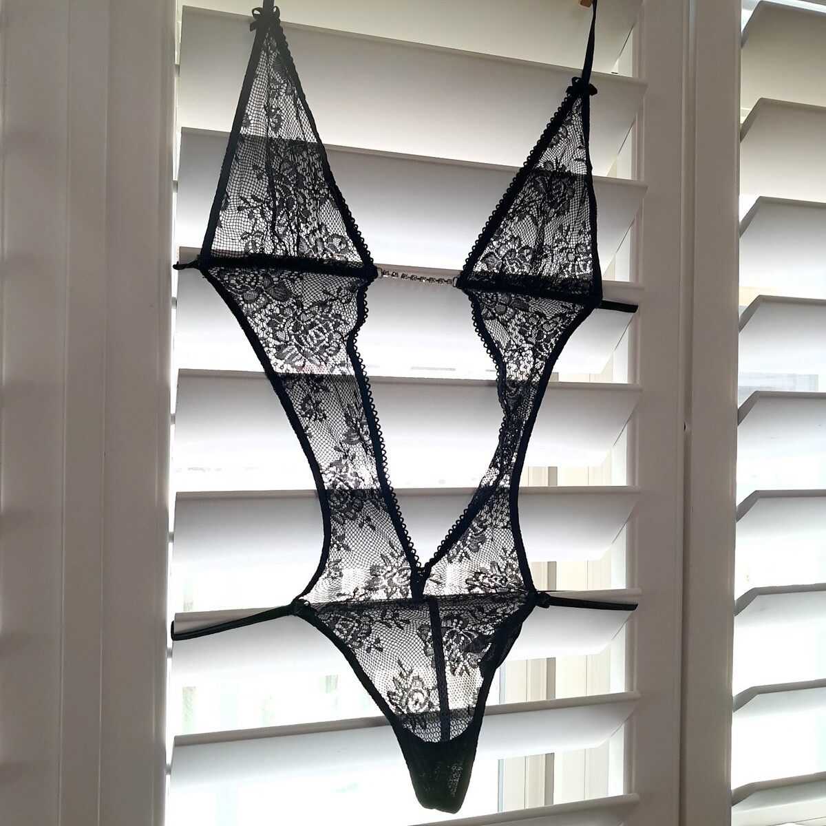 Sheer black lace with rhinestones detail. One piece with thong bottom.