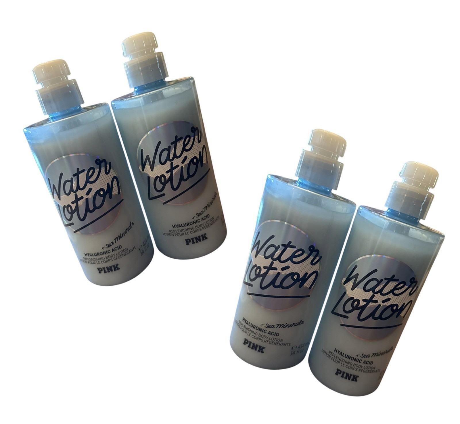 VICTORIA'S SECRET PINK Lot of (4) 14 fl oz Bottles with Pumps of WATER BODY LOTION-HYALURONIC ACID +SEA MINERALS-NEW