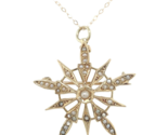 14k yellow gold brooch in a starburst design that is set with about thirty-six seed pearls. There is a fold down bail to be worn as a pendant. It measures 1" in diameter or 1 1/8" with bail. The necklace with chain weighs 2.88 dwt. It dates from the 1890s with a new 18" 14k chain. Captivating!