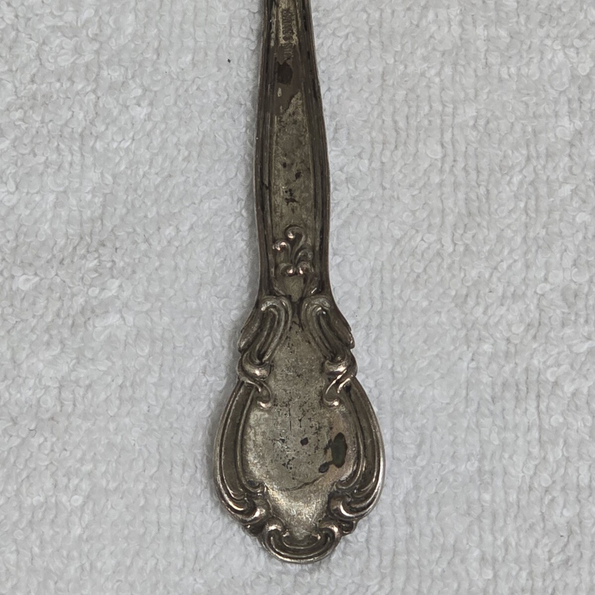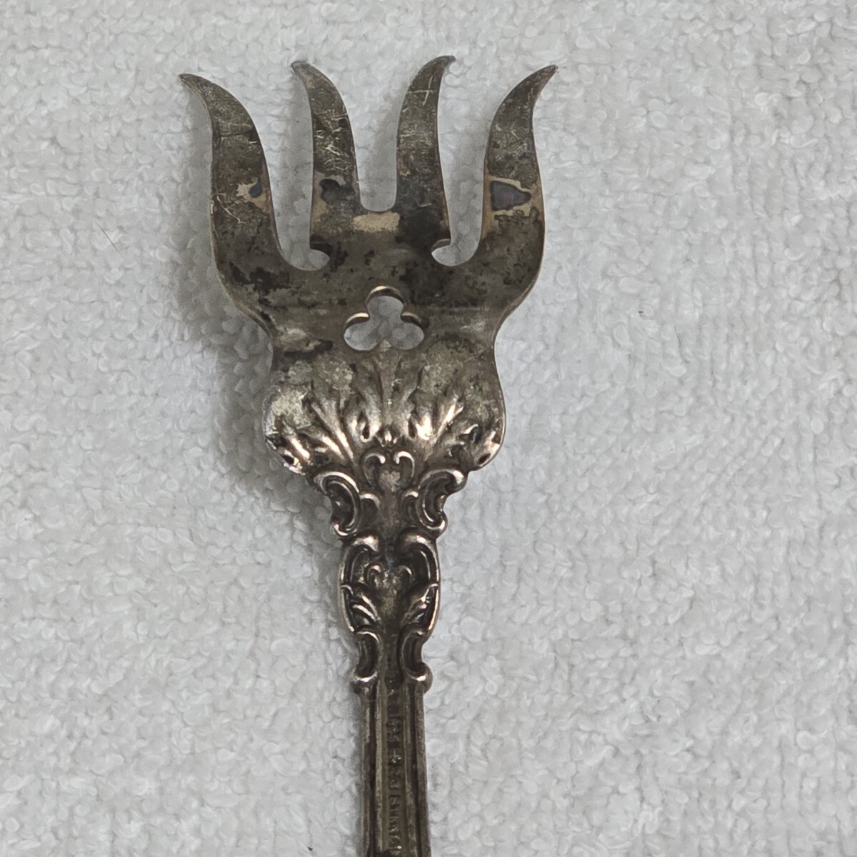 Stunning antique sterling silver cold meat fork, patented 1895. Marked STERLING and JAMES MIX. Features an elegant Victorian-era design with pierced tines and ornate floral detailing. A collectible piece of fine flatware with lasting character.
